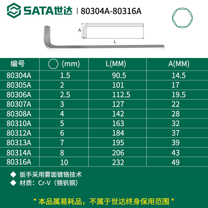 Sata/世达铬钒钢特长内六角扳手