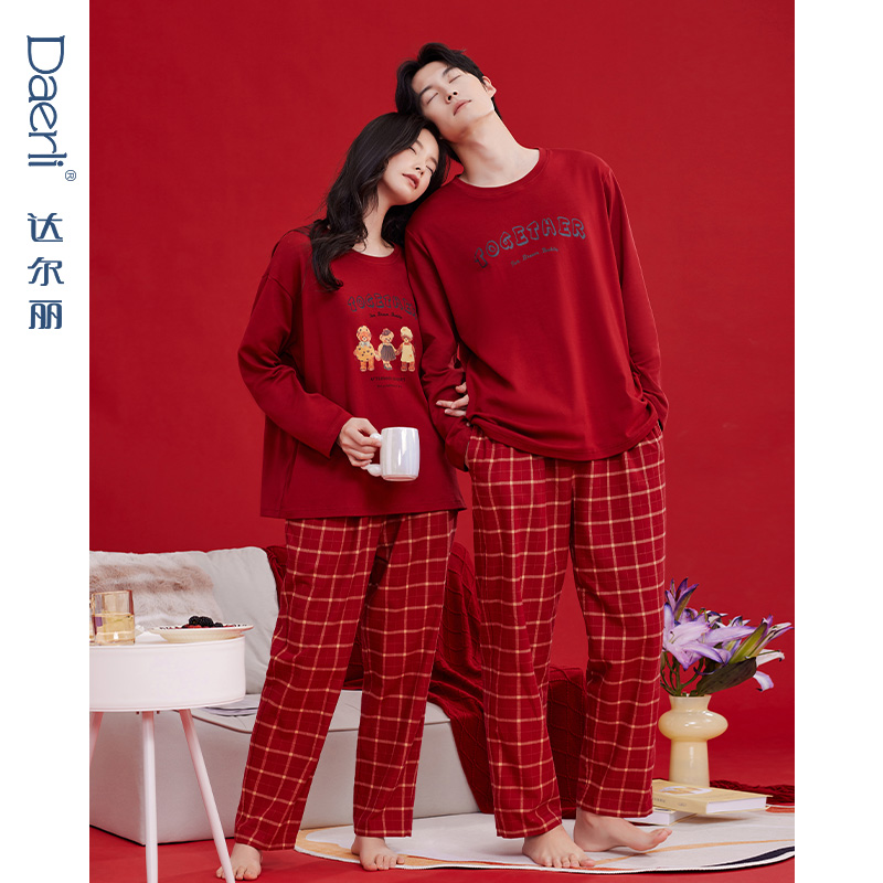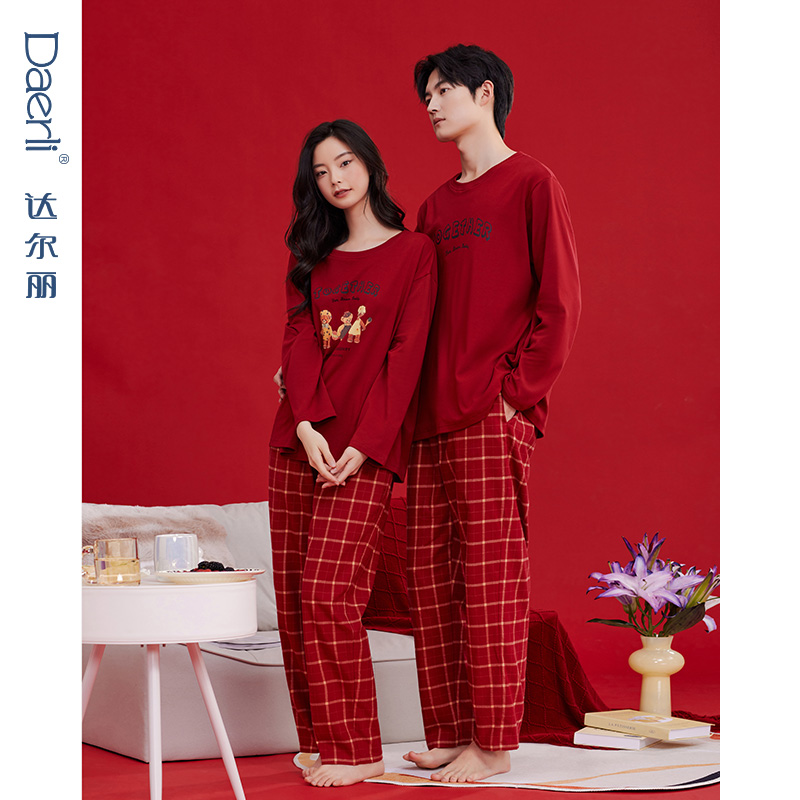 达尔丽红色圆领情侣睡衣女春秋季纯棉长袖印花新婚本命年家居服男