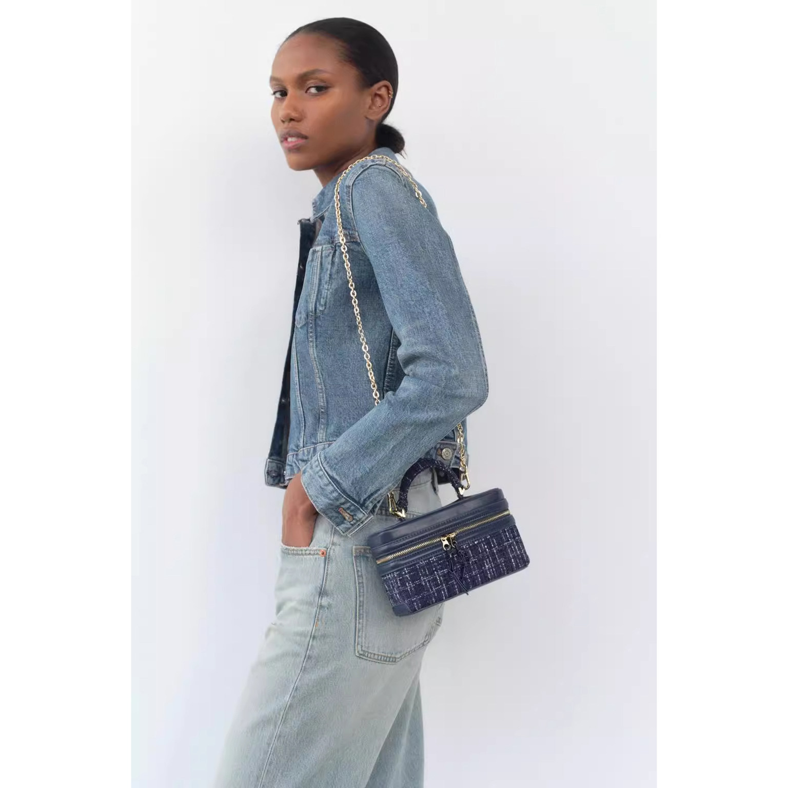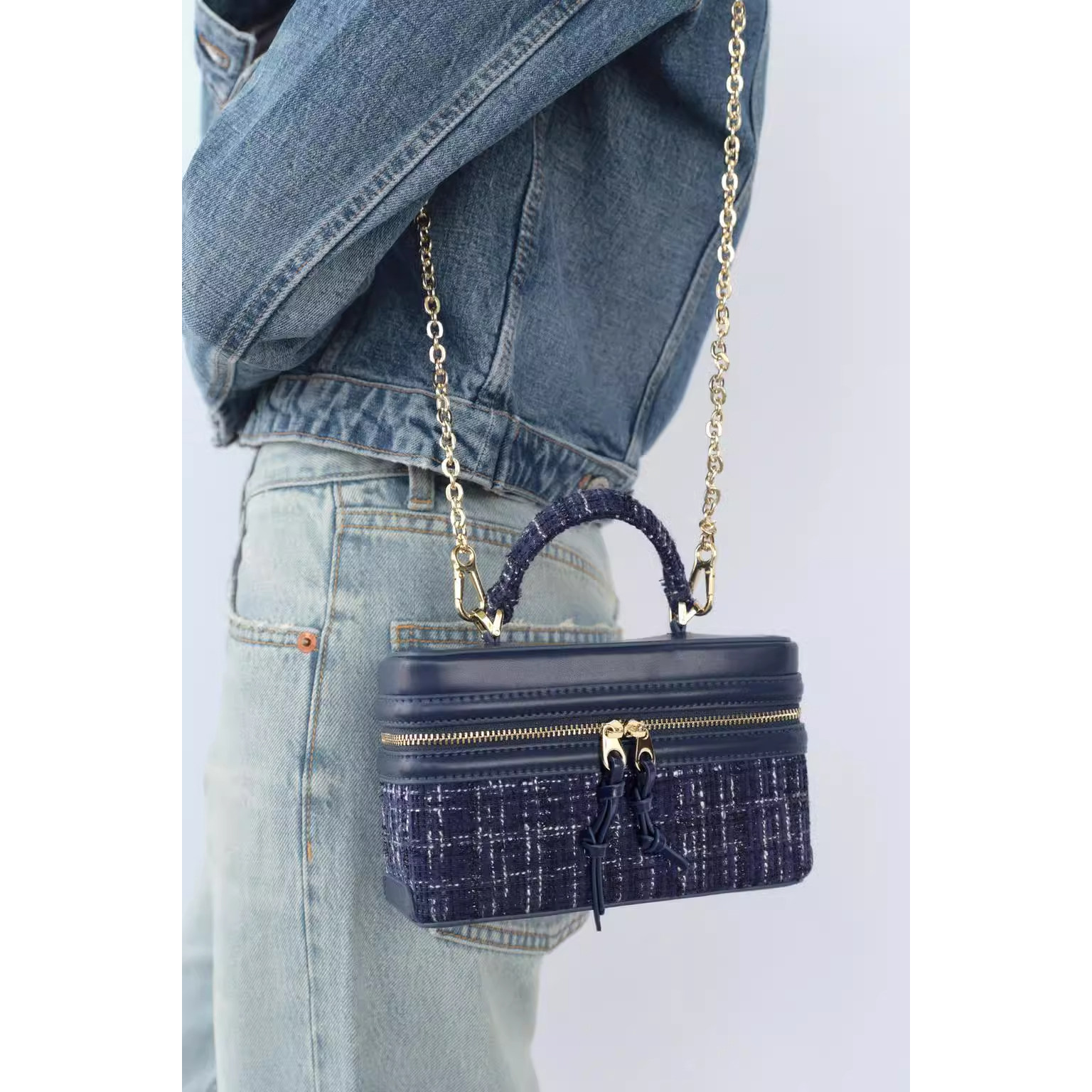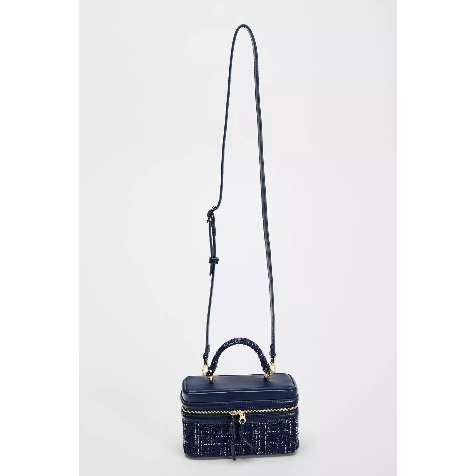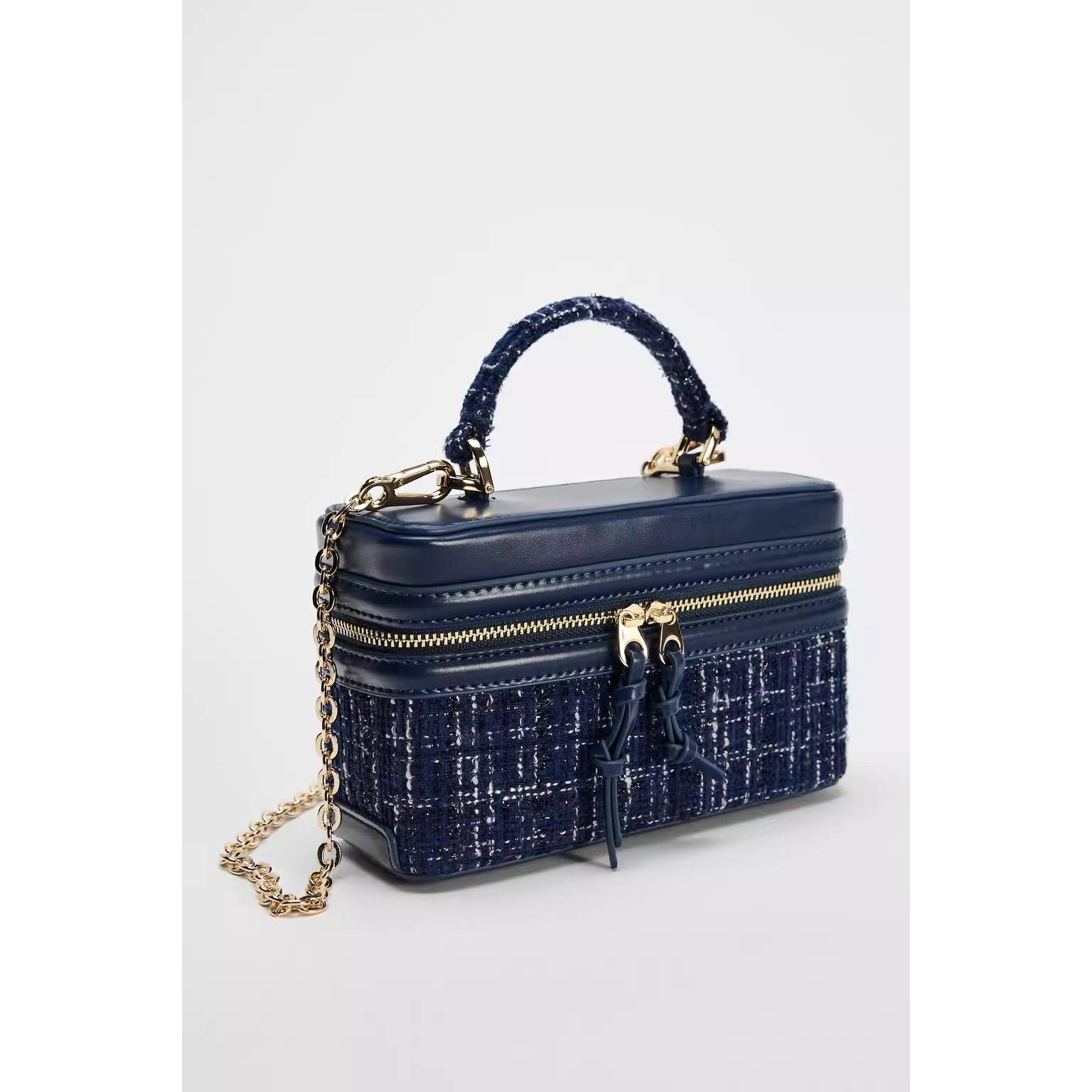 Z家2025冬季新品女包蓝色毛呢格纹盒子包时尚百搭手提斜挎小方包