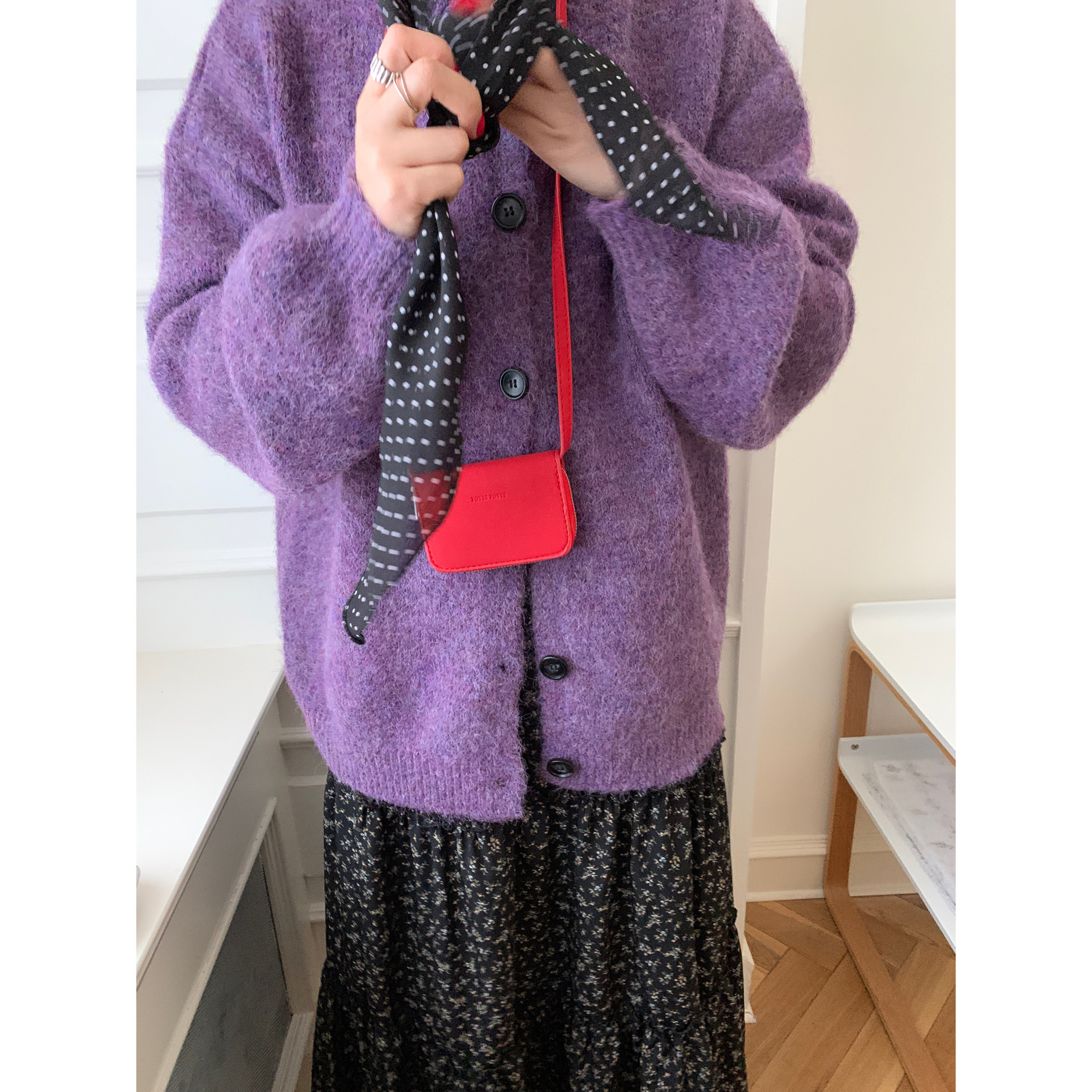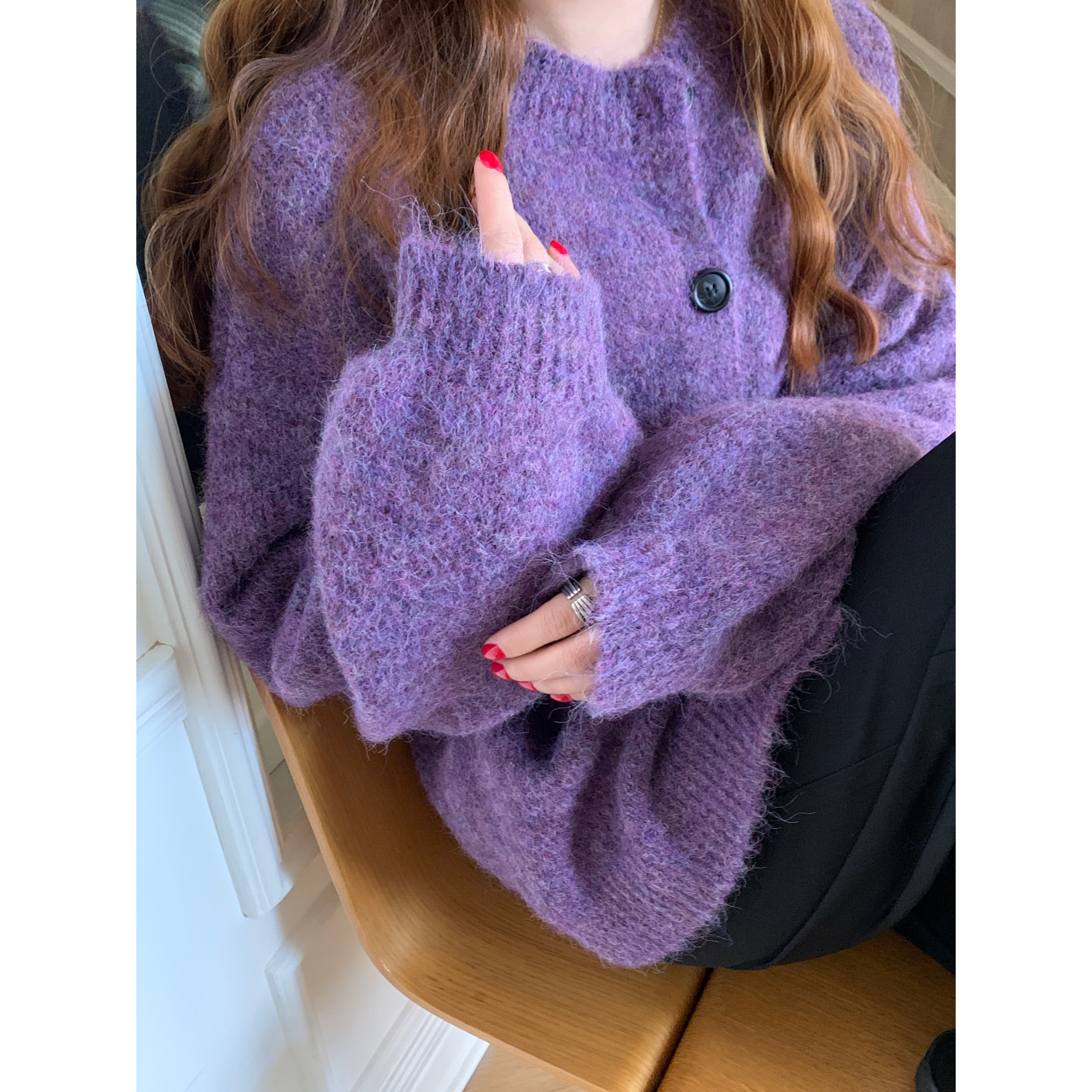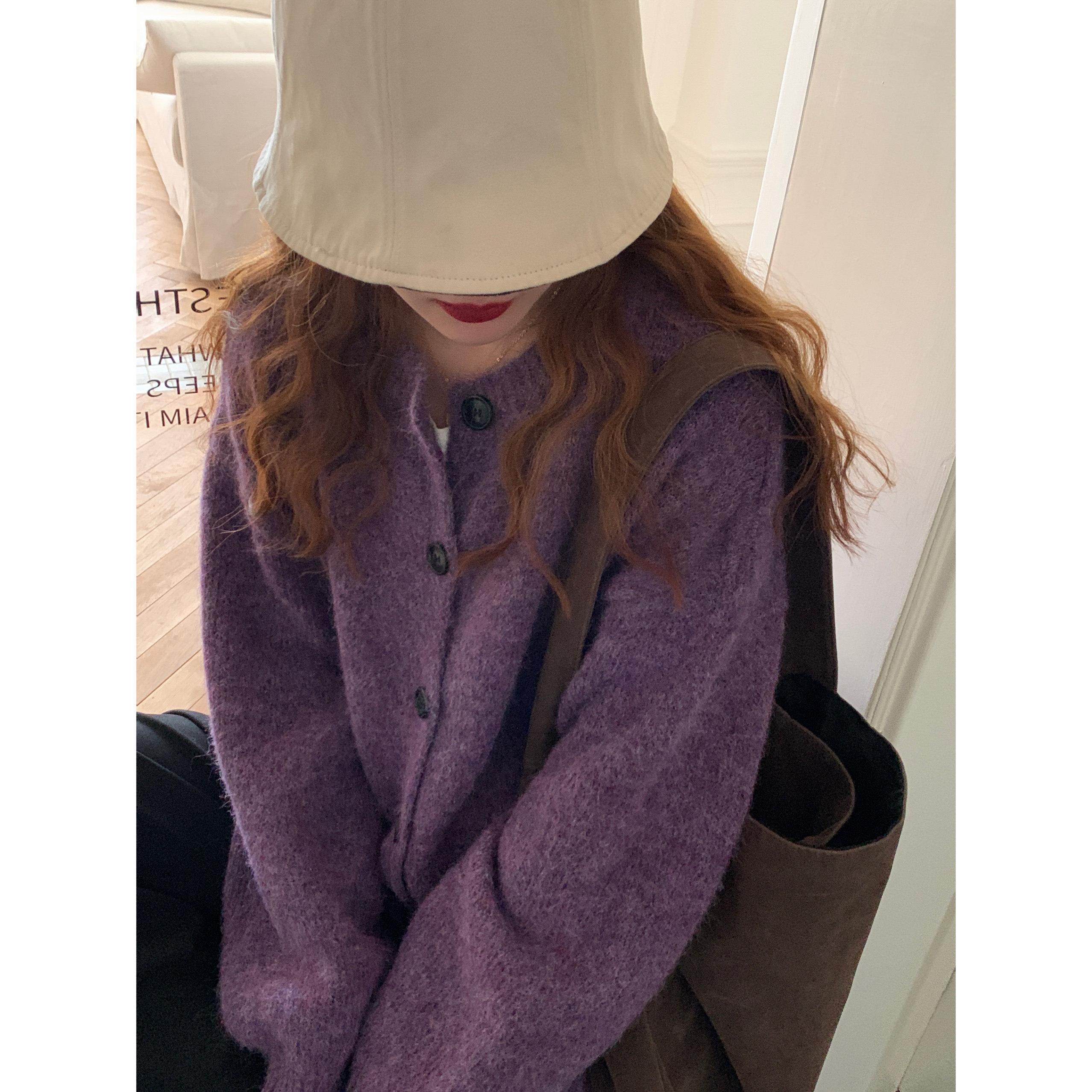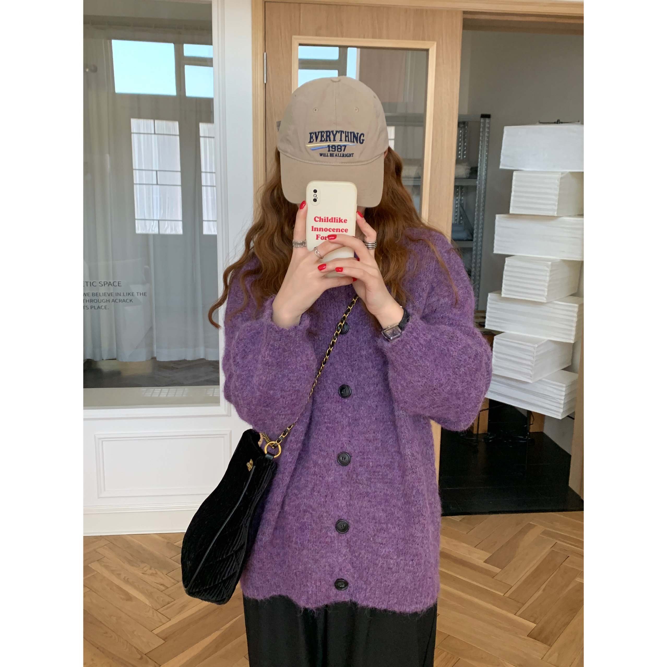 葡萄紫色毛衣外套女春秋2025韩版宽松外穿慵懒风加厚针织开衫上衣