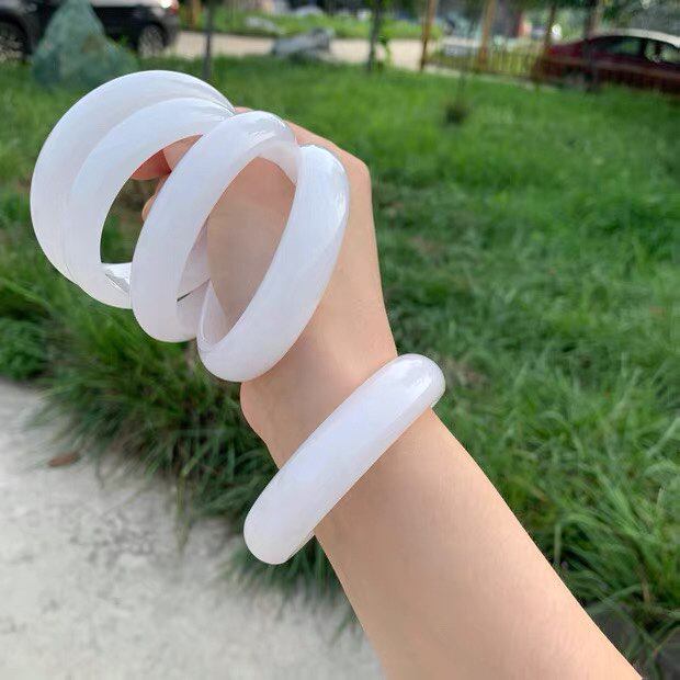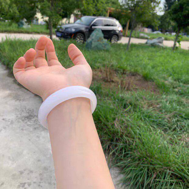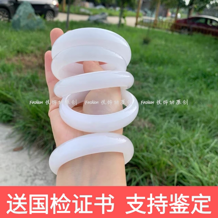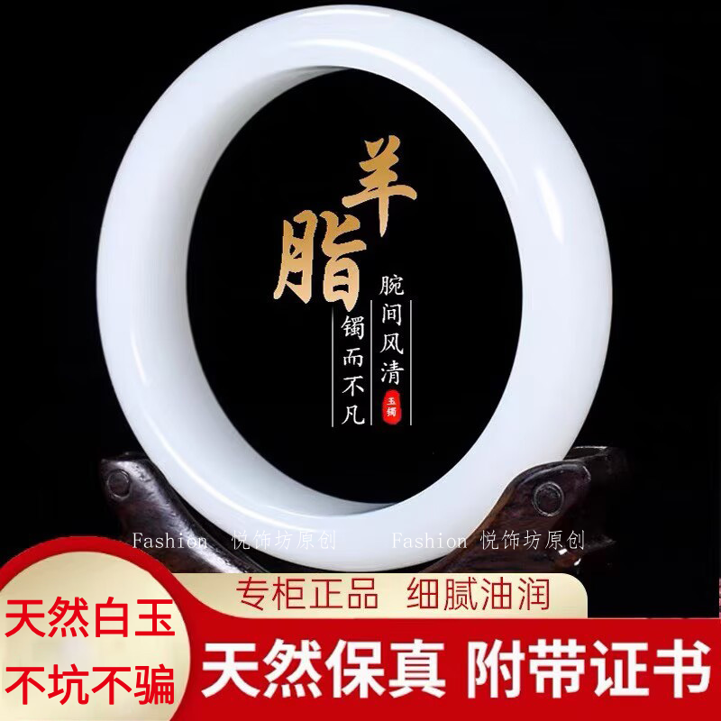 天然新疆和田羊脂白金丝玉手镯女款宽扁条轮胎正品真白玉平安镯子