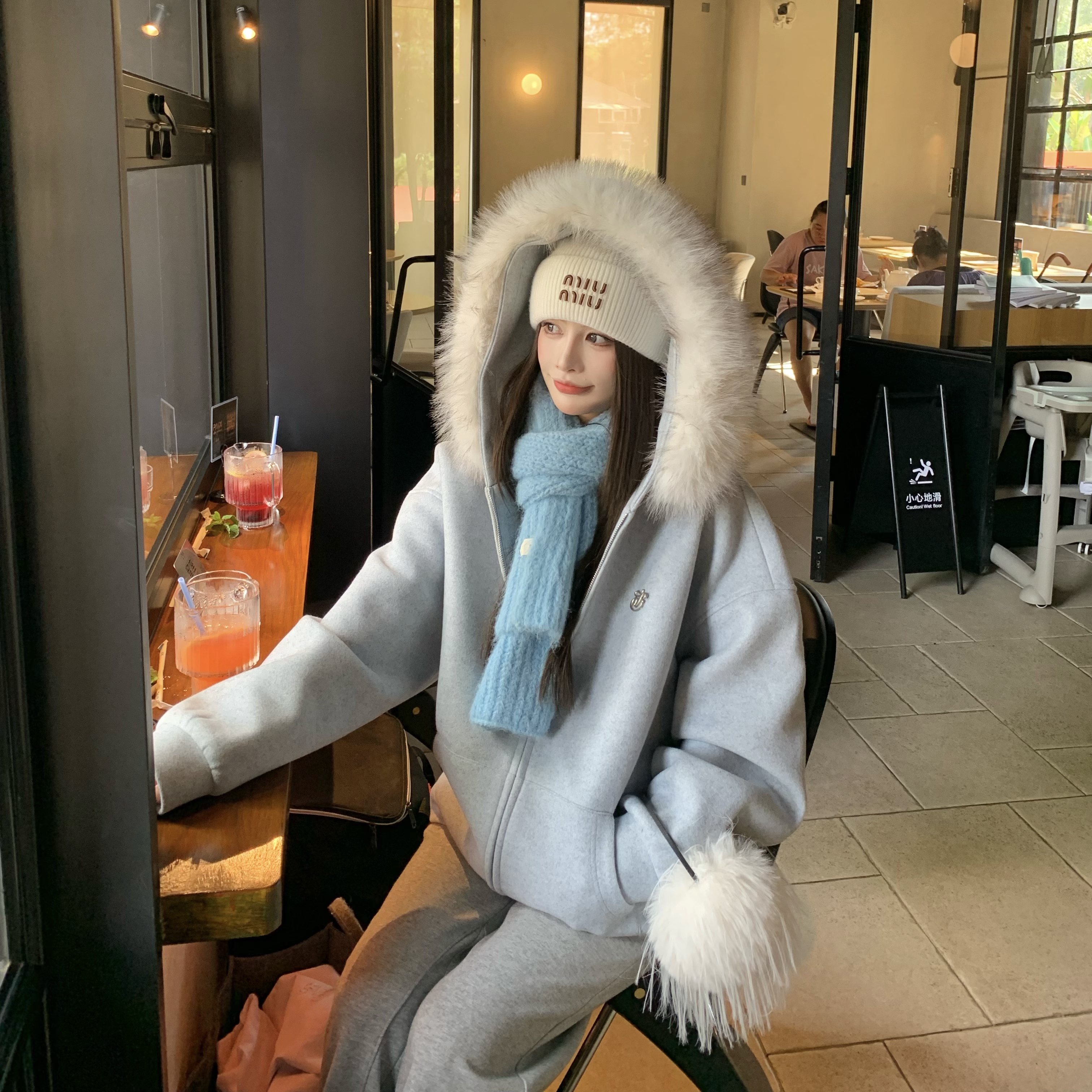 3MER哦哦三妹 连帽毛领呢子大衣加厚保暖秋冬新款拉链卫衣外套女