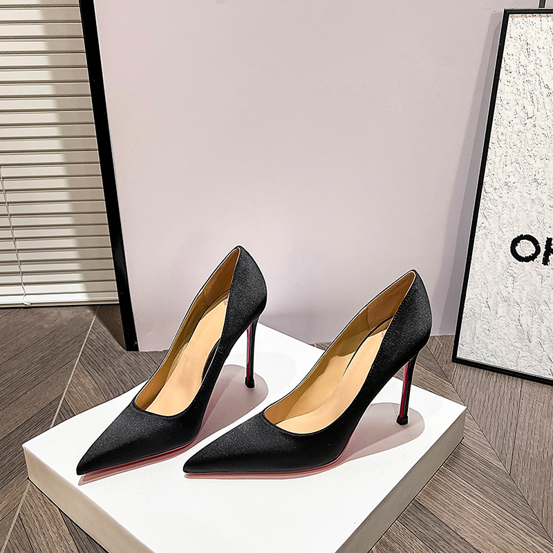 路客森黑色高跟鞋女2025新款绸缎尖头CL红底性感细跟浅口单鞋女