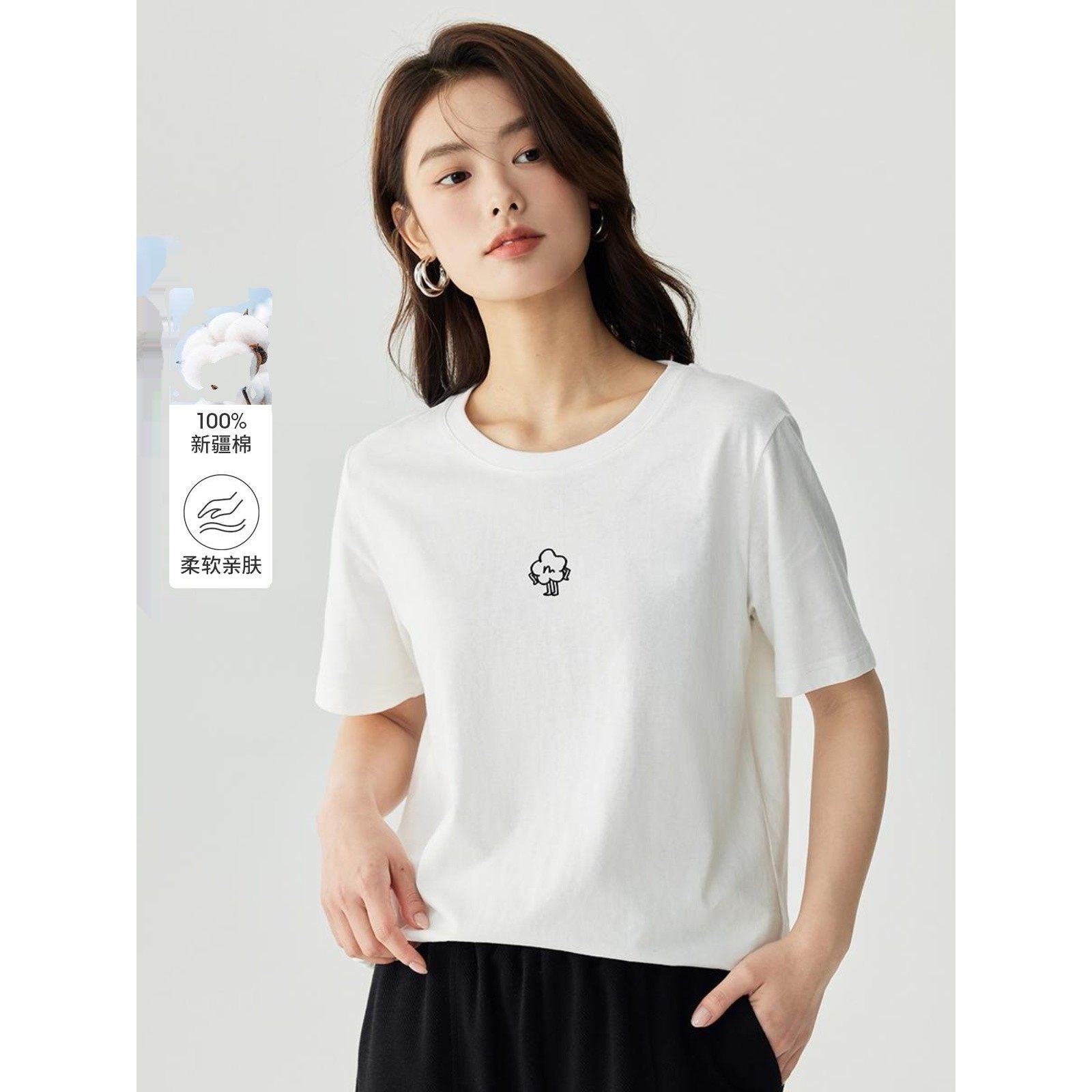茵曼全棉印花舒适短袖白T