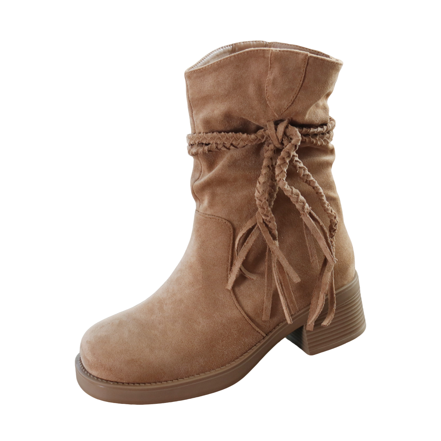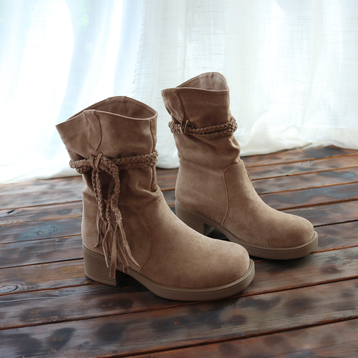 复古中筒靴子废土风流苏骑士靴粗跟不过膝长筒靴显瘦堆堆西部靴女