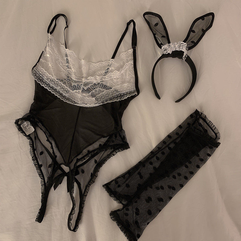 纯欲网红性感黑色蕾丝吊带连体内衣女开档免脱情调诱惑套装送手套