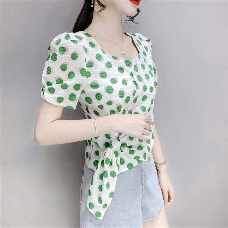 2025年新款夏季设计感小众修身短款上衣法式方领波点雪纺衫女短袖