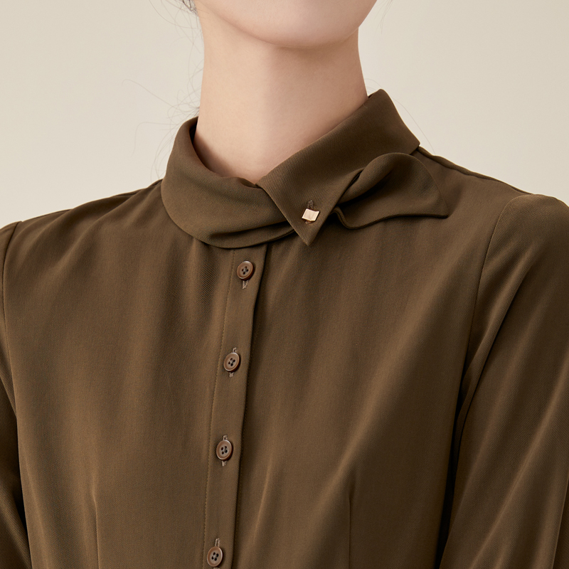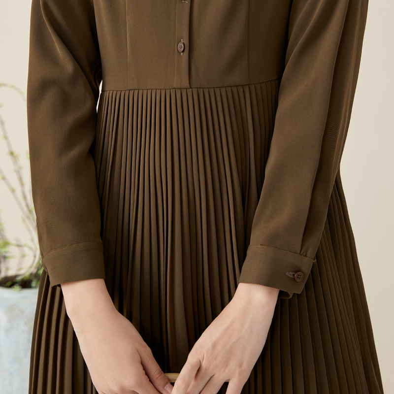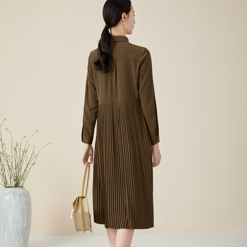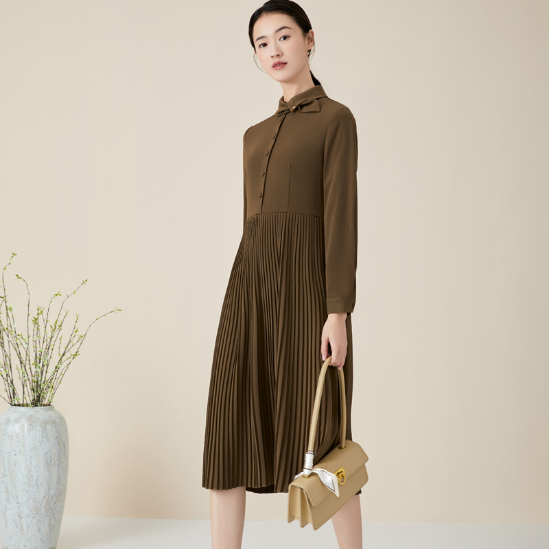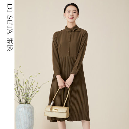 玳莎春秋法式不对称领连衣裙新款温柔气质秋装宽松长袖百褶裙女装