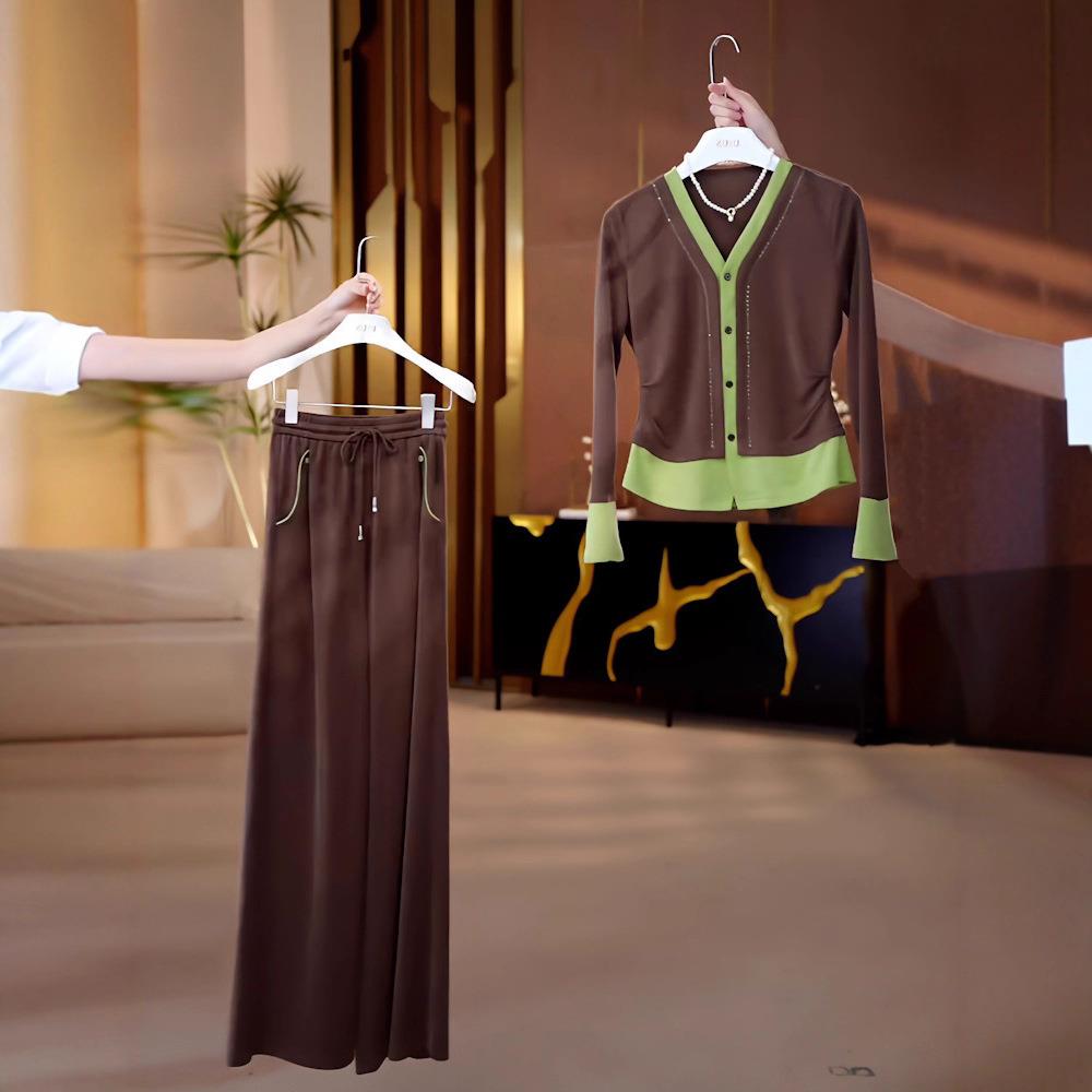 长袖感时尚两件套领套装欧货阔腿裤2025修身v上衣女气质高级秋季