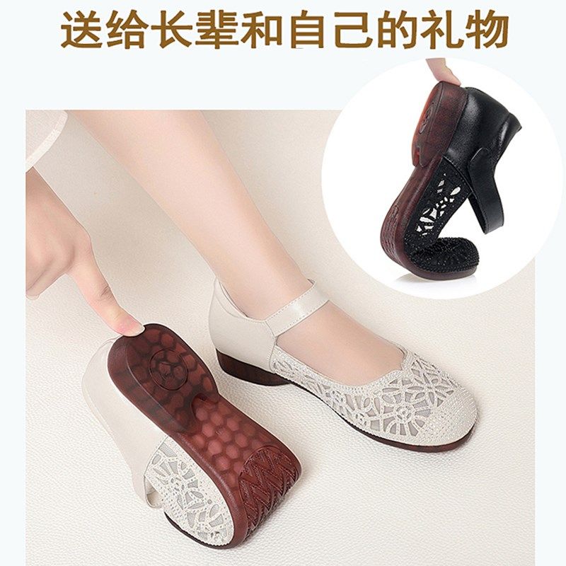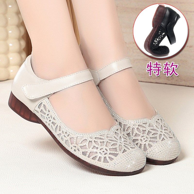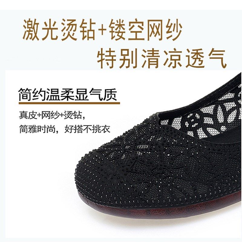 网纱真皮女鞋夏季镂空透气凉鞋薄款单鞋平底中老年妈妈软底舞蹈鞋