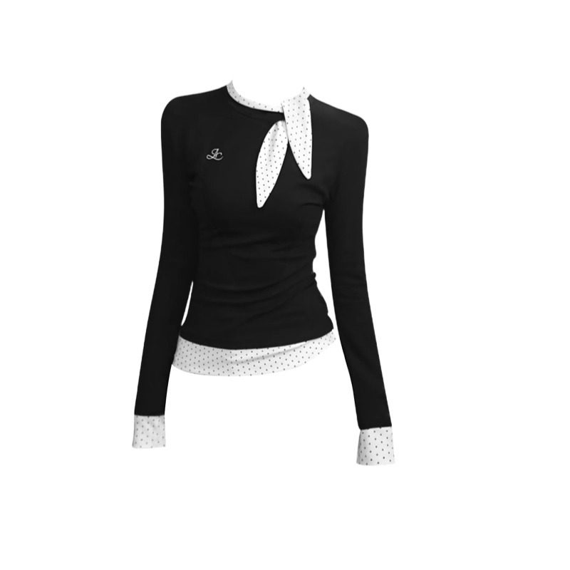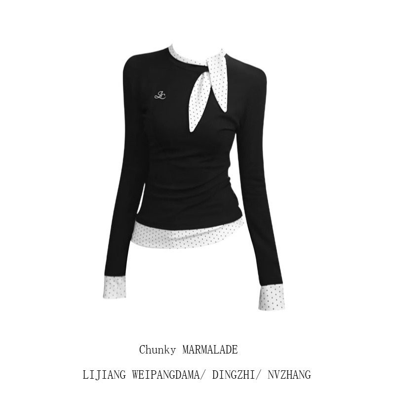 大码韩系蝴蝶结波点拼接长袖t恤女秋季修身显瘦内搭假两件打底衫