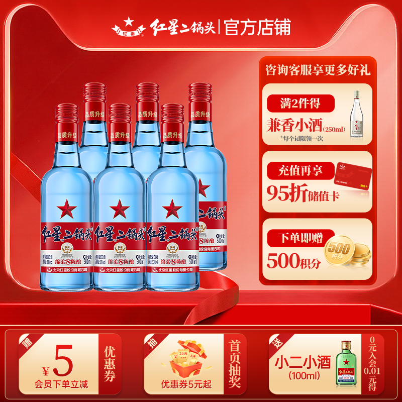 蓝瓶绵柔8 53度6瓶清香型白酒 北京红星二锅头纯粮酿造高度口粮酒