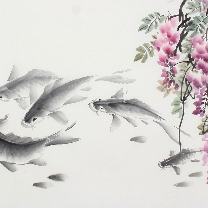 连年有余字画九鱼图紫藤花鸟画办公室客厅招财装饰画风水挂画书画