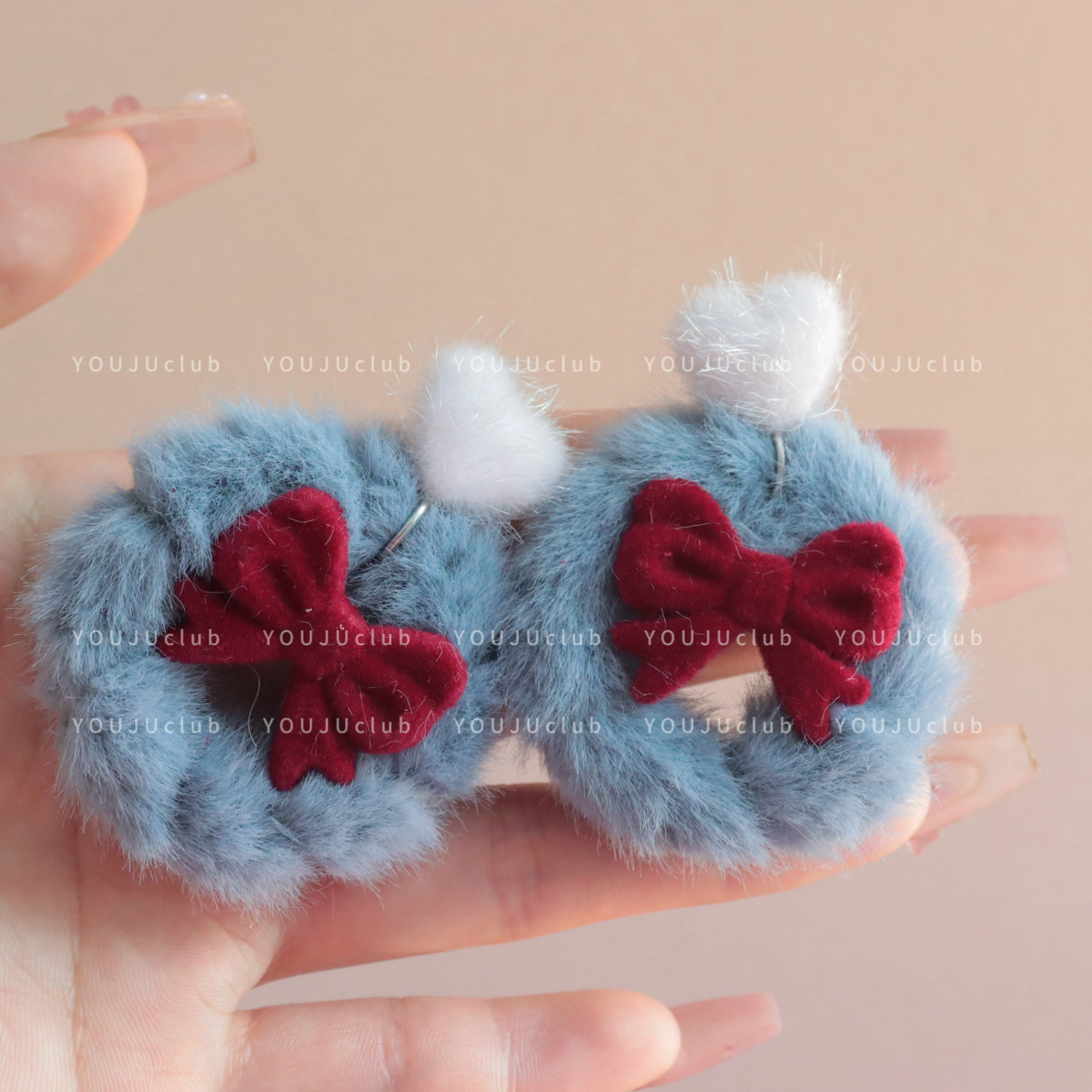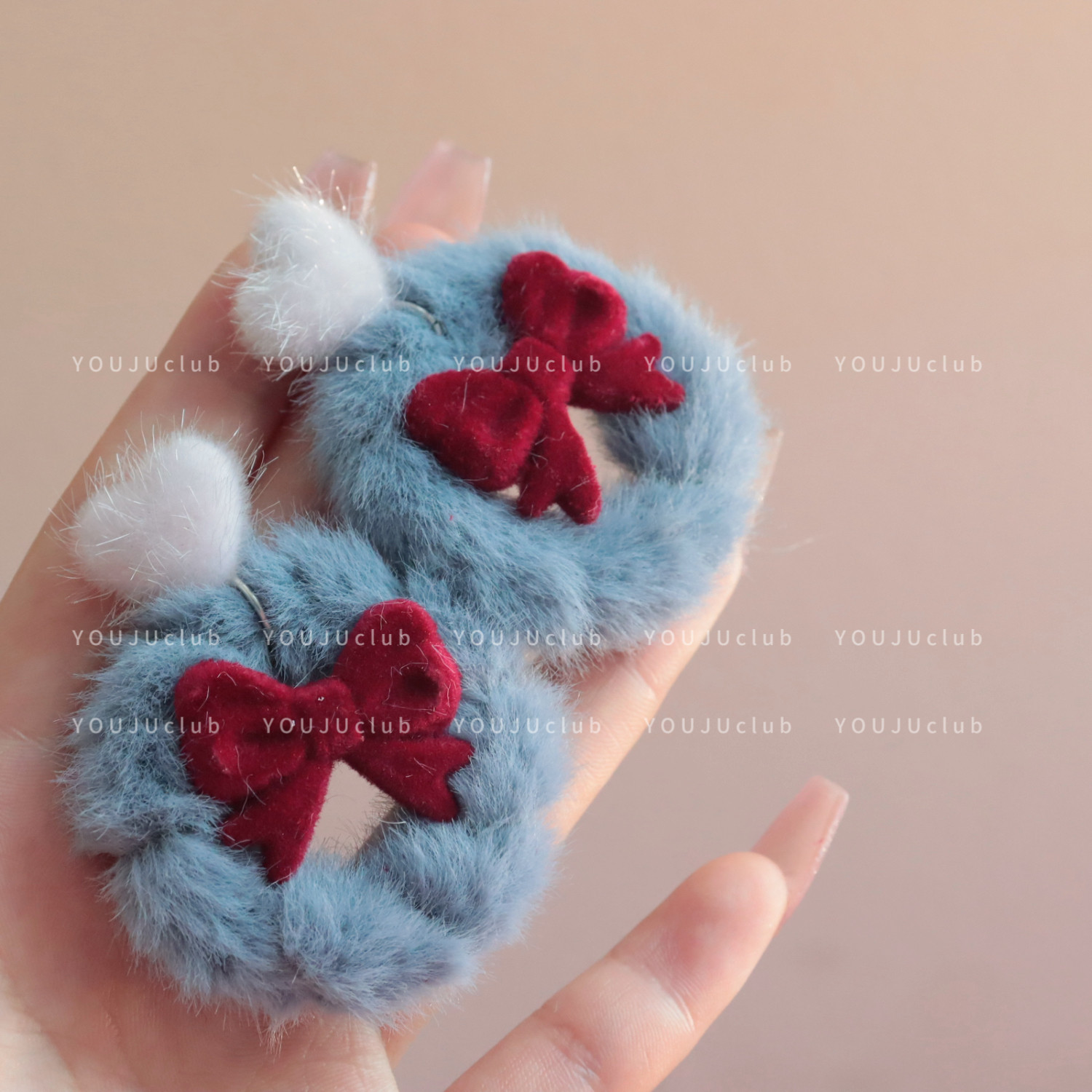 YOUJUclub-丝绒少女~蓝色毛绒蝴蝶结耳环减龄显脸小蚊香盘耳夹