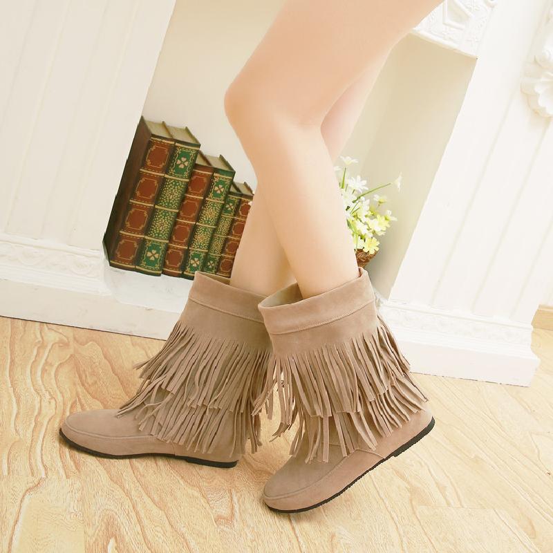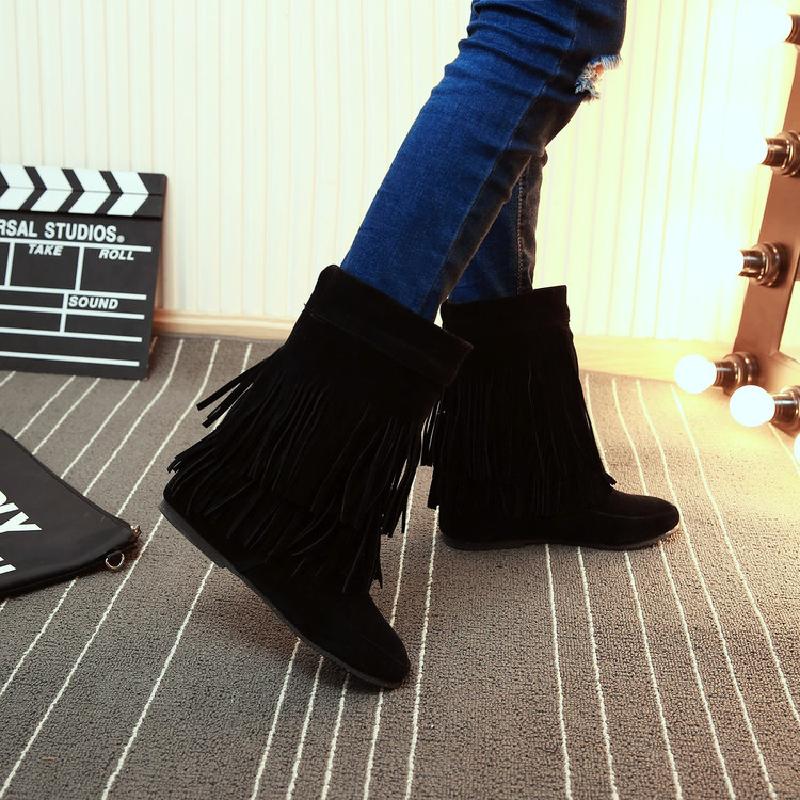 冬季女鞋大码磨砂圆头中跟内增高短靴女靴平底中筒流苏靴加绒棉鞋