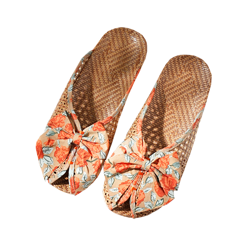 夏季新款滕草编织凉席半包头女韩版蝴蝶结碎花竹编家居室内凉拖鞋