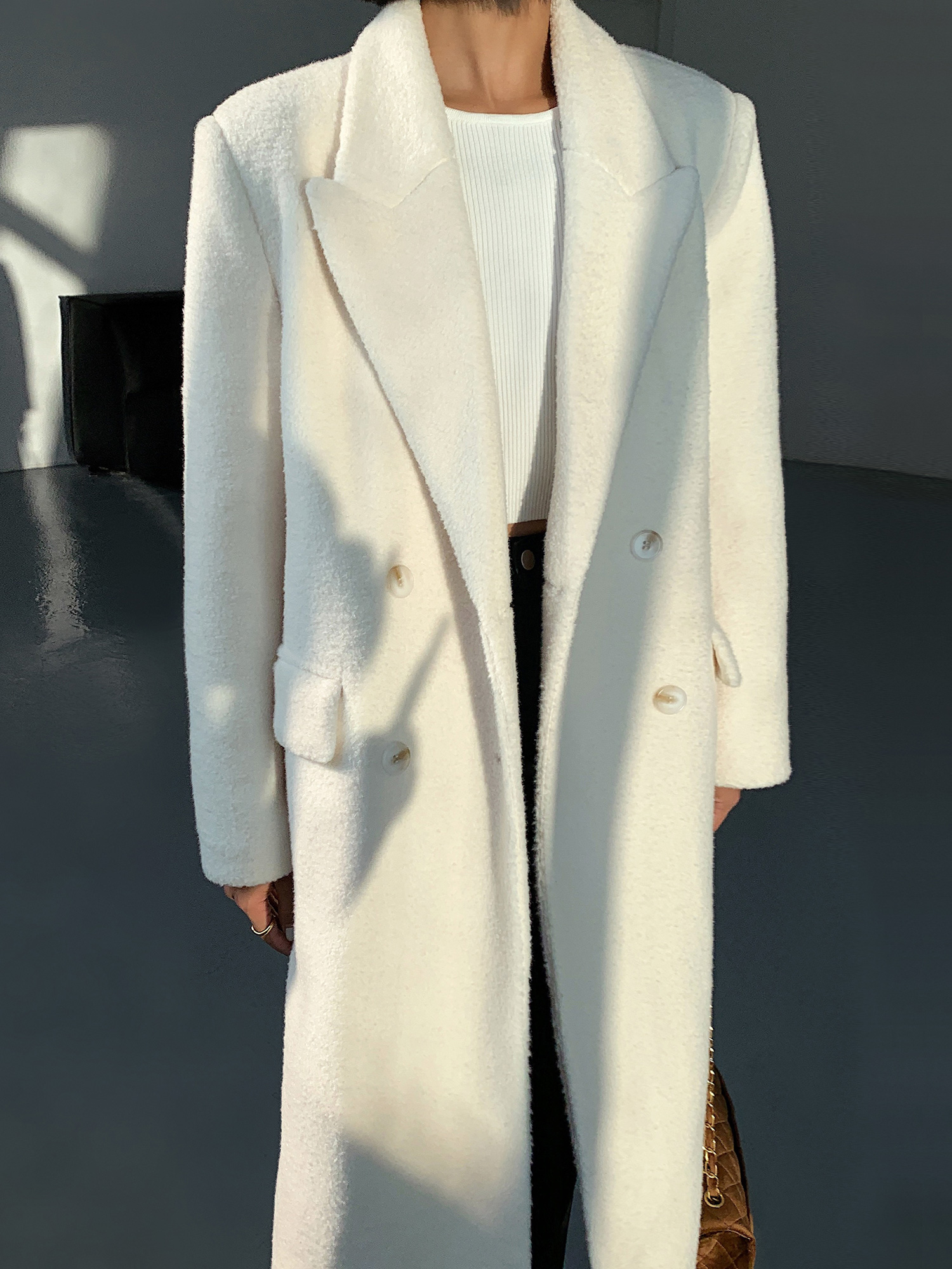 奶白色毛绒绒中长款毛呢外套