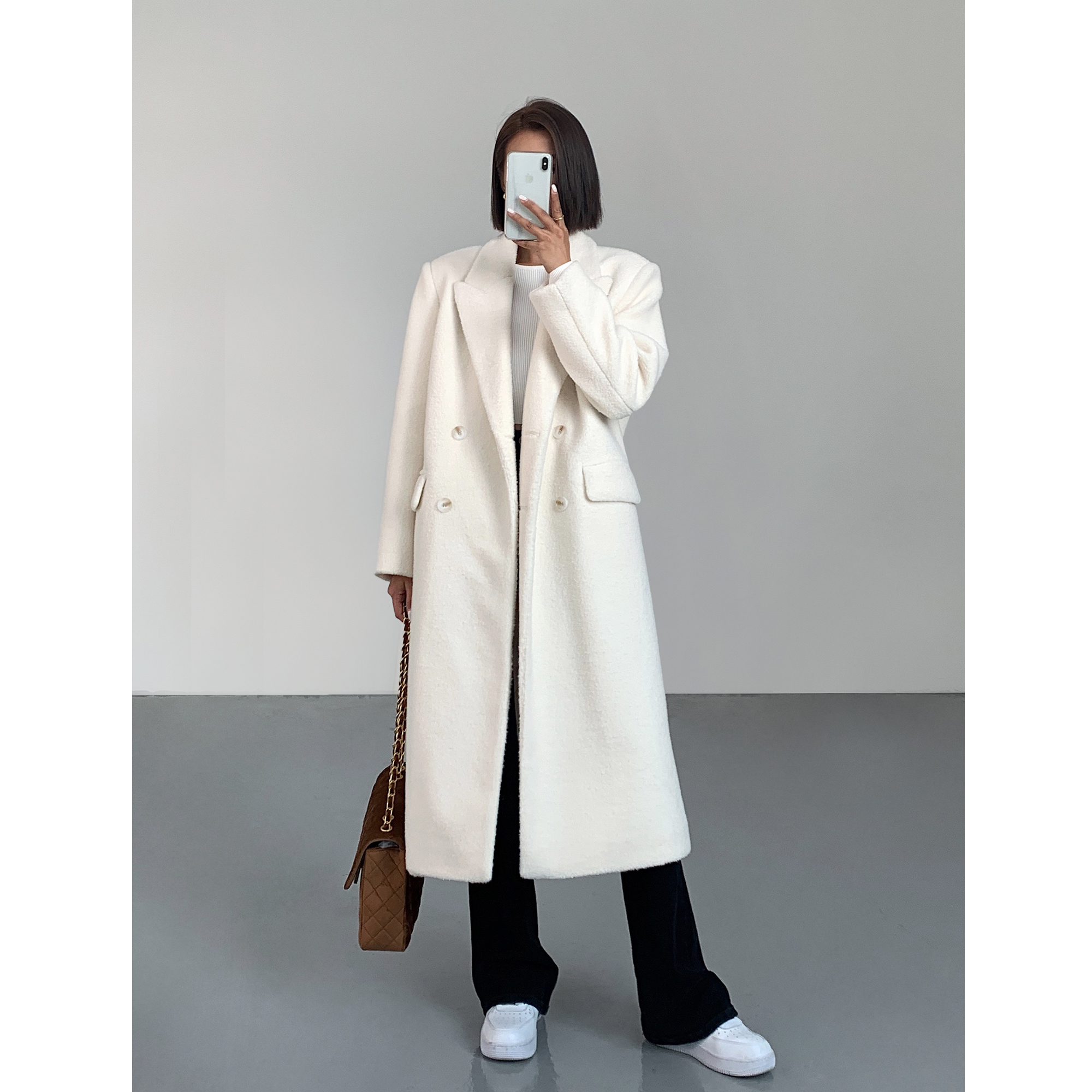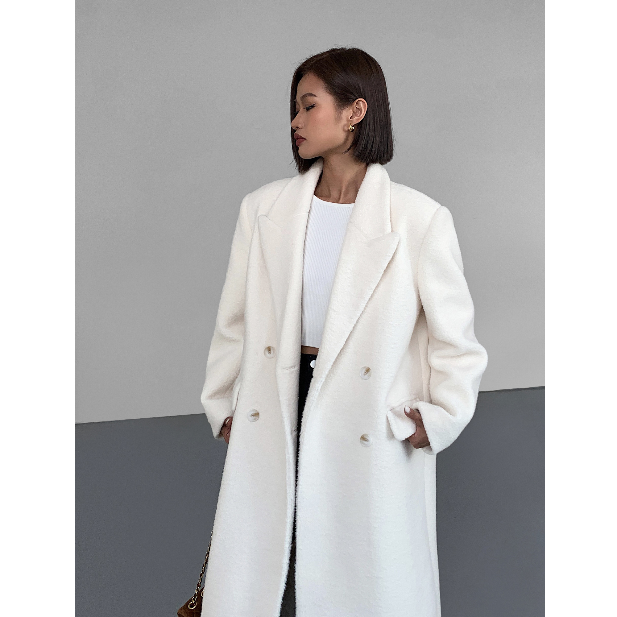 ousph白色过膝中长款毛呢外套女夹棉加厚冬高级感西装领呢子大衣