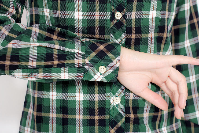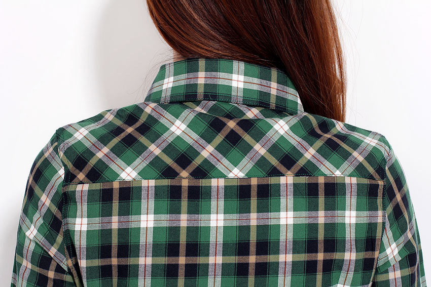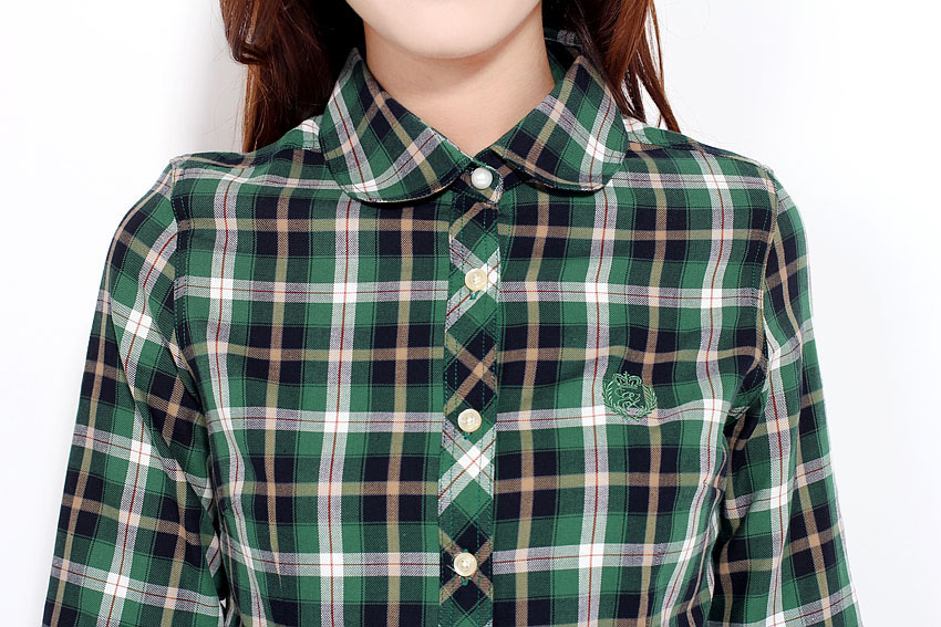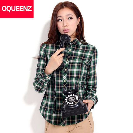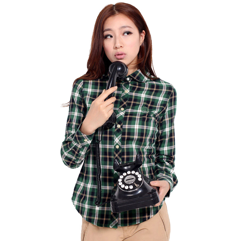 甜美气质元宝领韩版修身英伦纯棉格子衬衫女春秋长袖格纹衬衣上衣