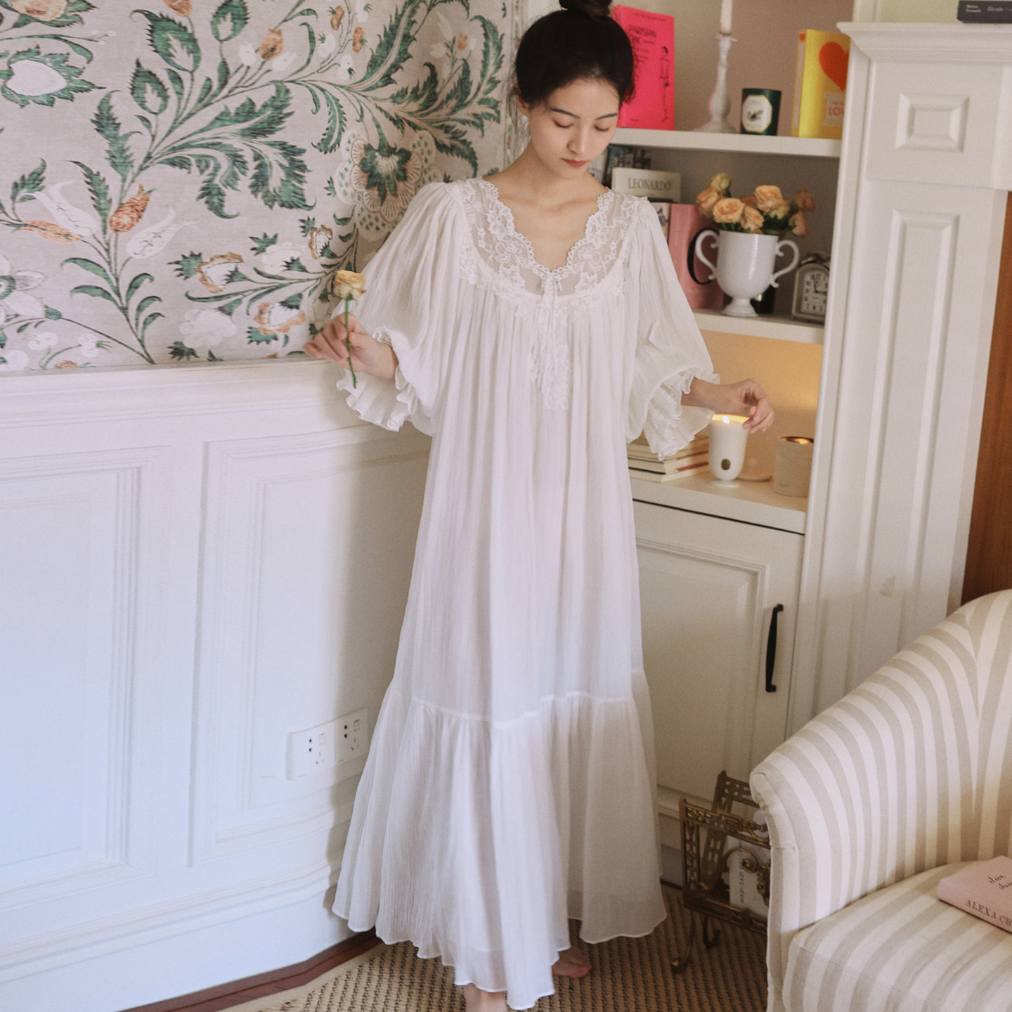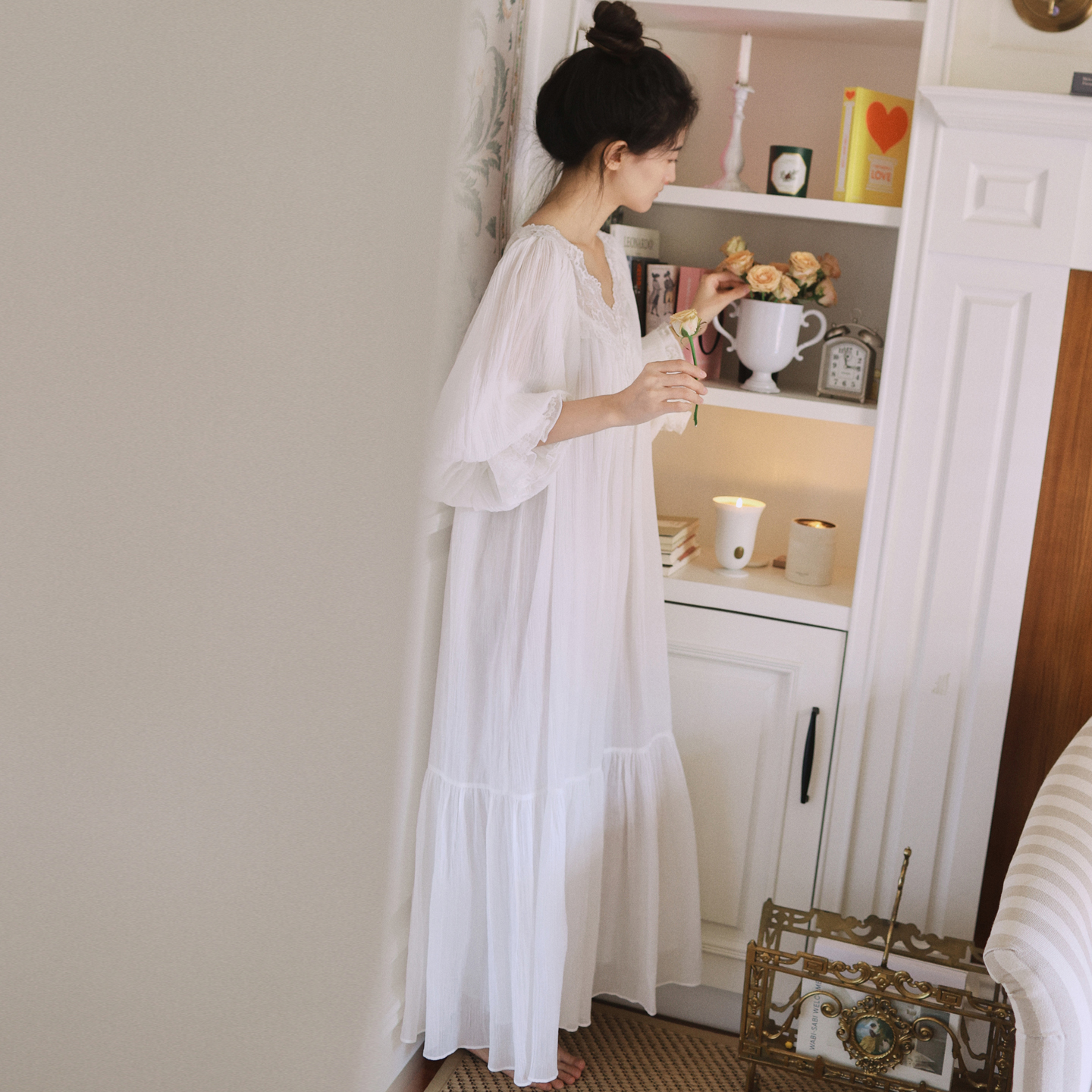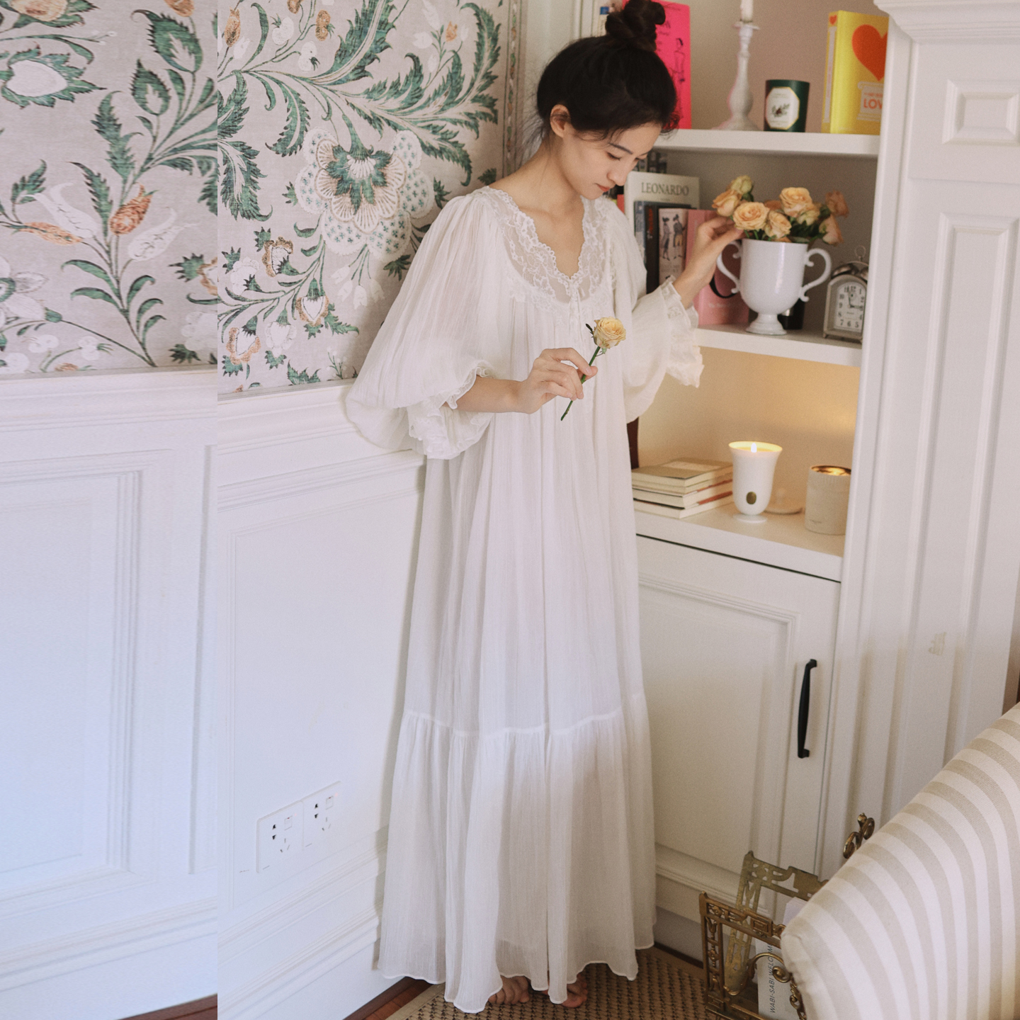 春秋女士纯棉宫廷风睡裙长款长袖女款性感秋季睡衣女法式白色睡袍