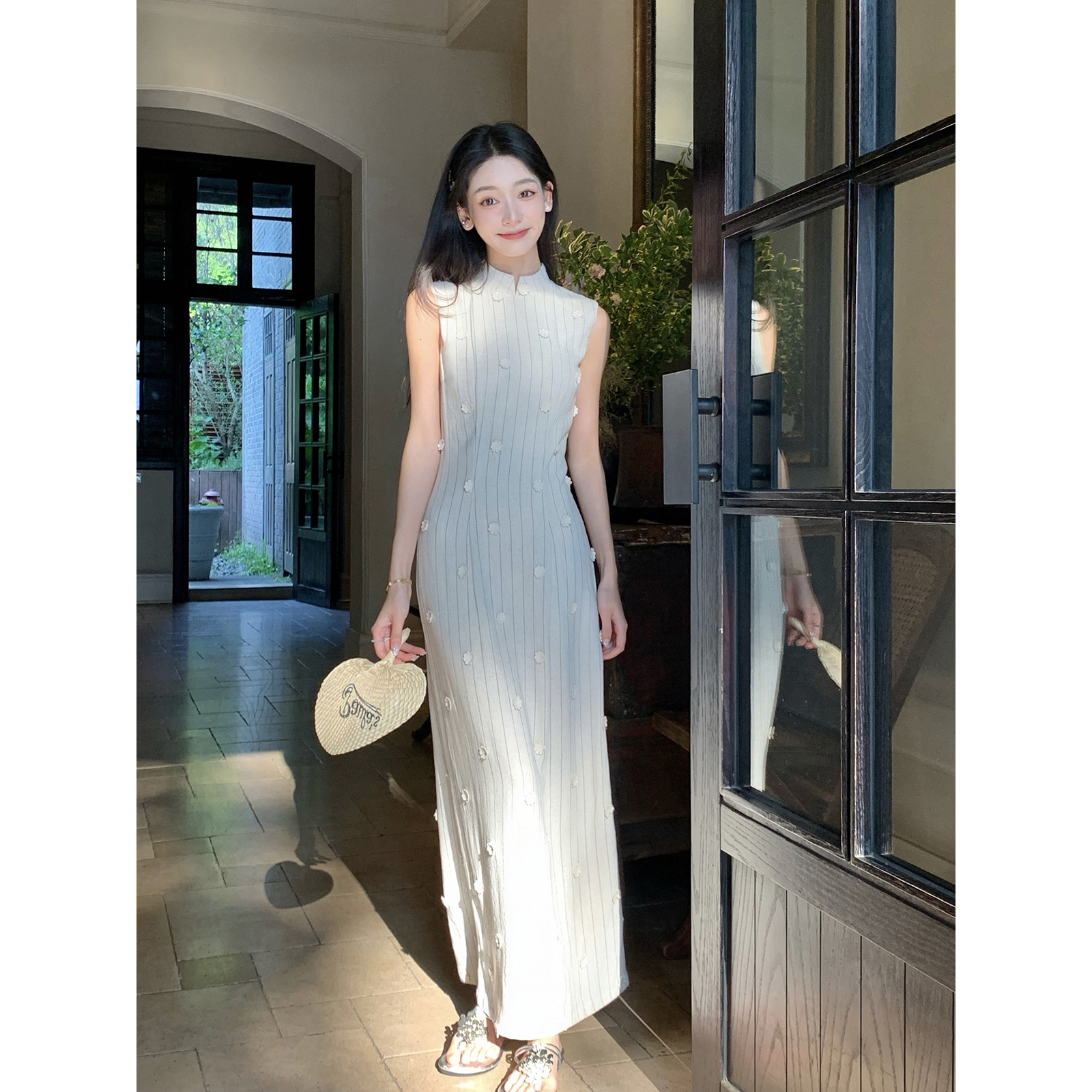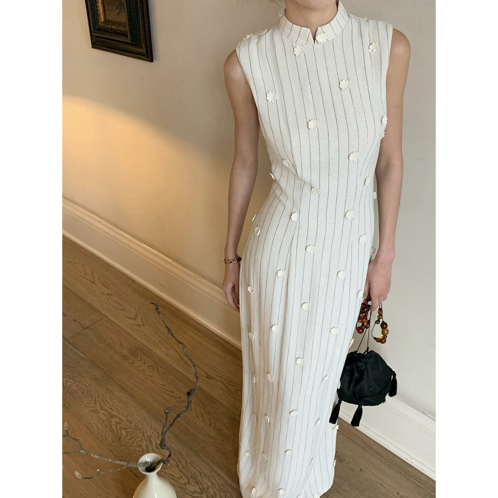 Thecoco 棉麻立体小花气质无袖旗袍女装夏季收腰显瘦减龄垂顺长裙
