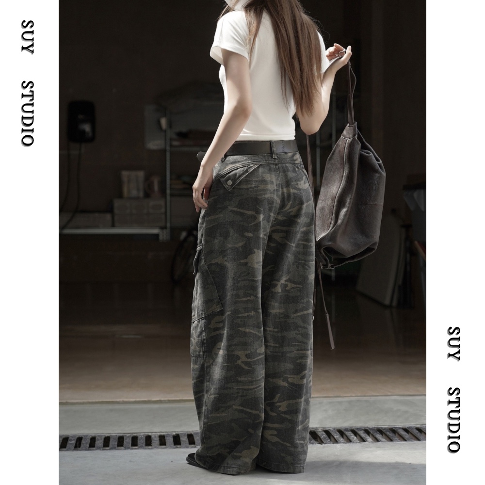 日系新款小个子遮肉显瘦立体口袋工装裤女ins潮牌复古迷彩阔腿裤