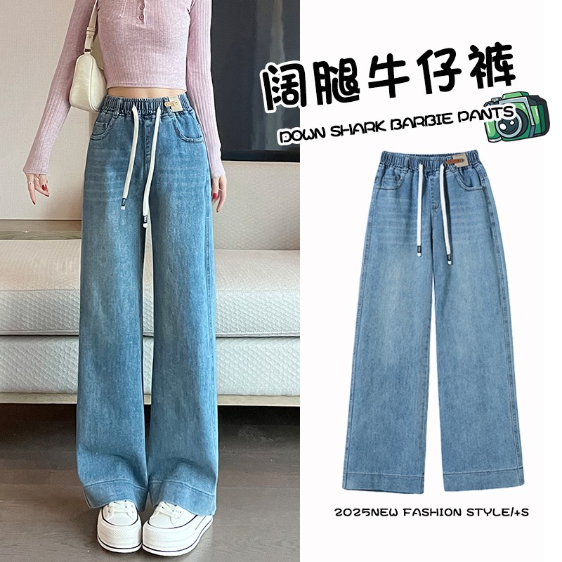 春夏季少女孩加长直筒牛仔裤初高中学生松紧腰百搭宽松显瘦阔腿裤