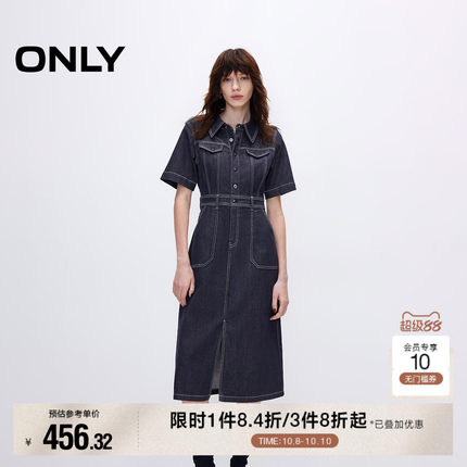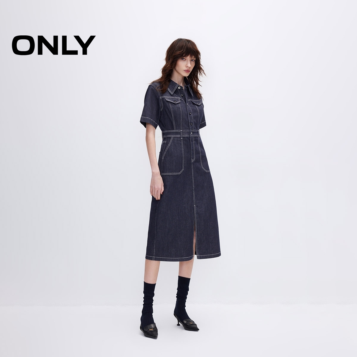 ONLY奥莱2025夏季新款优雅复古翻领修身短袖牛仔连衣裙女