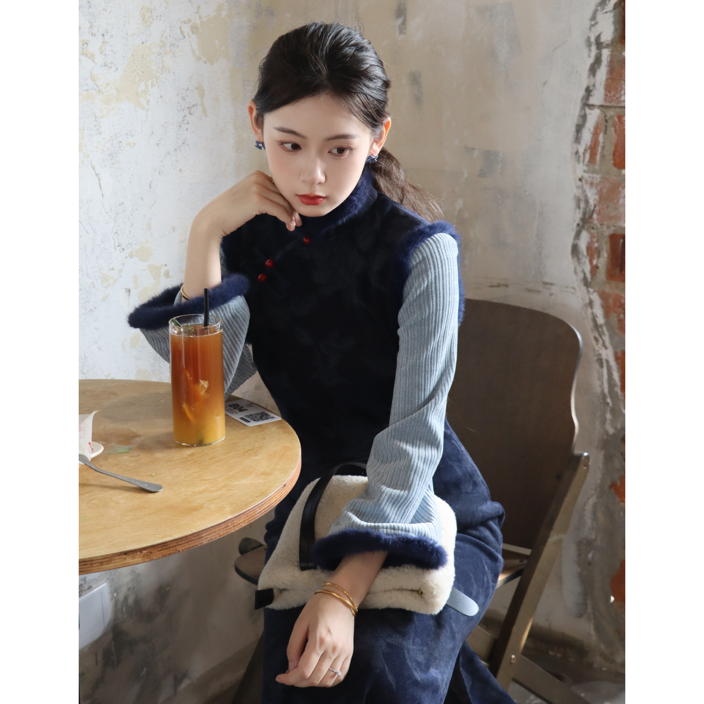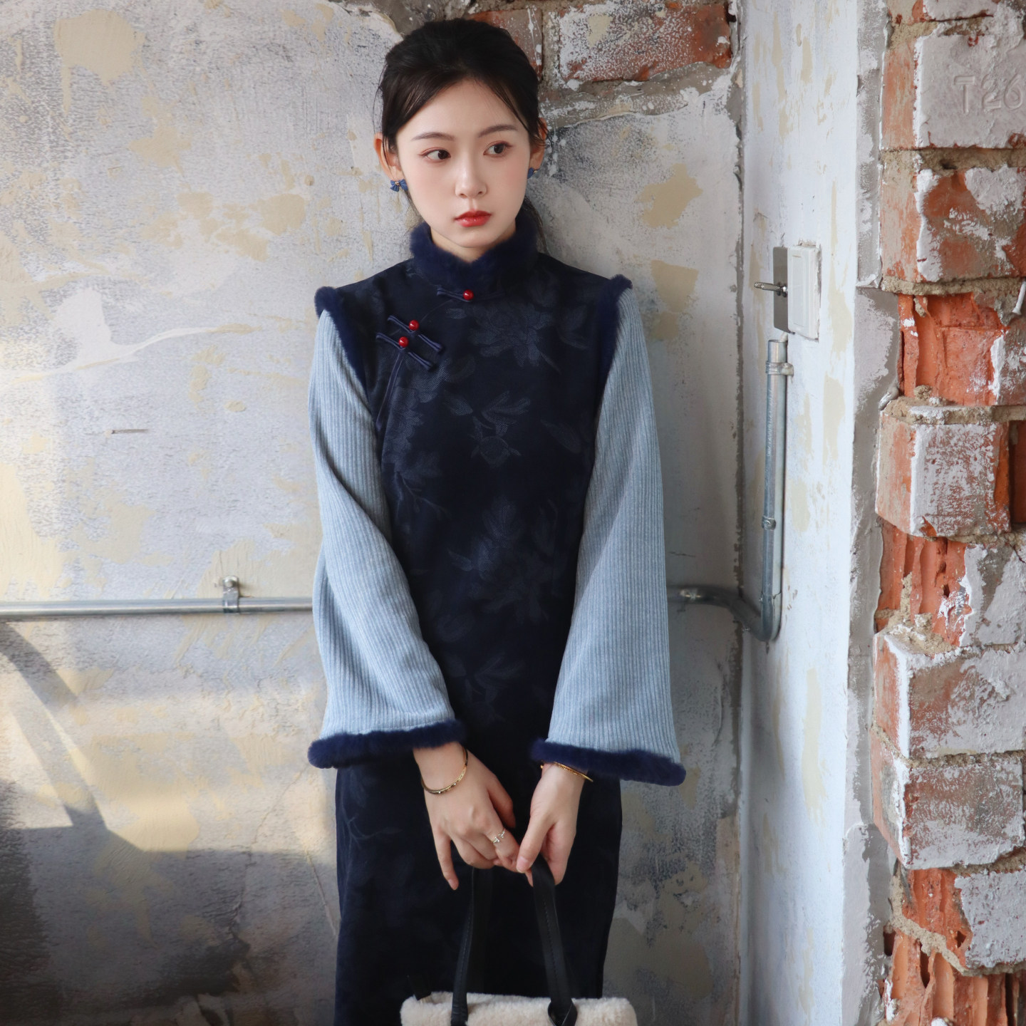 蓝笙冬装旗袍2025新款新中式加绒加厚冬季蓝色气质优雅复古女保暖