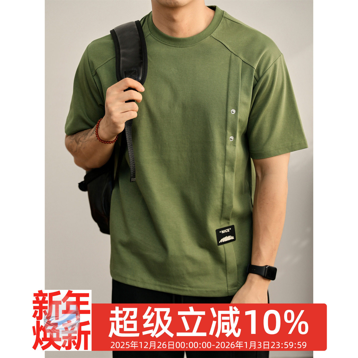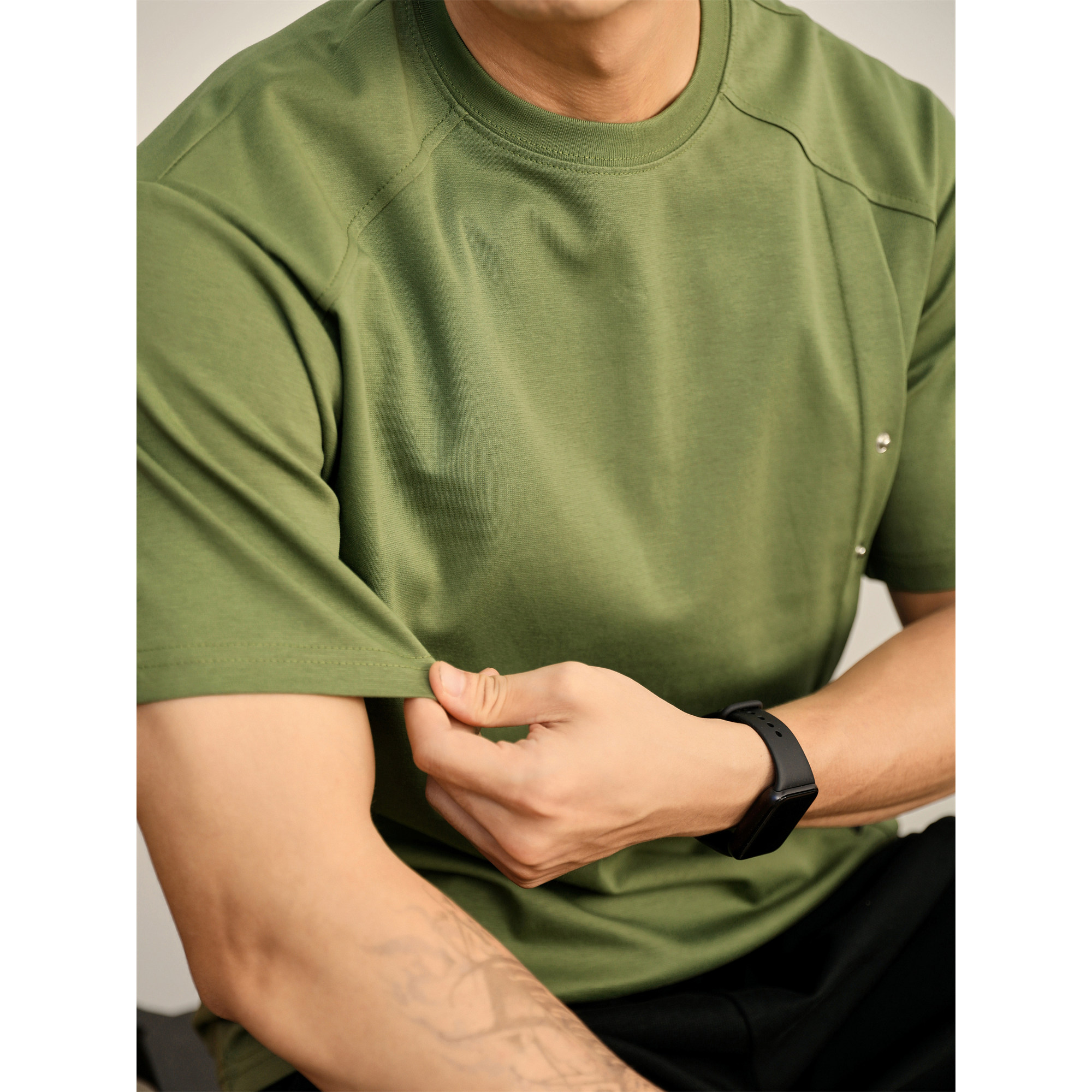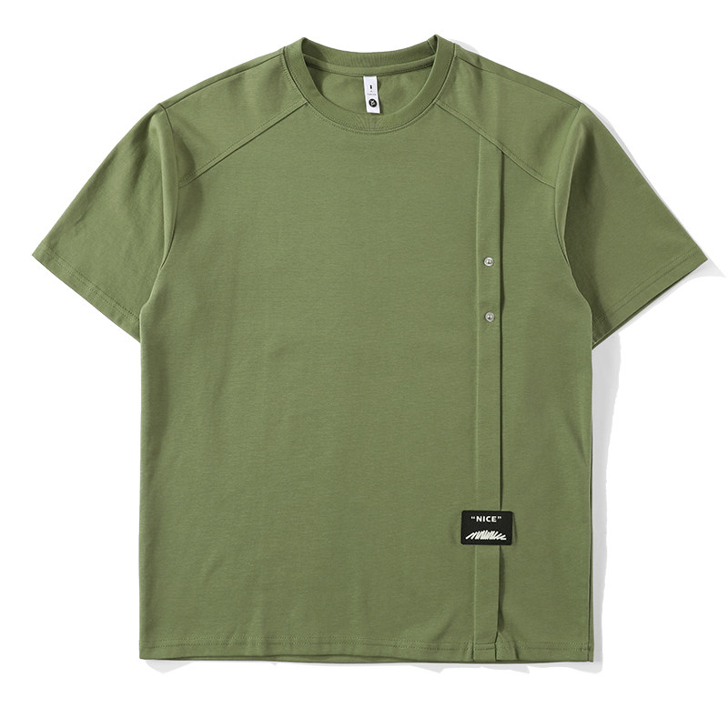 LUUD 树绿色贴布标T恤衫拼接铆钉扣设计圆领短袖立体裁剪上衣男夏