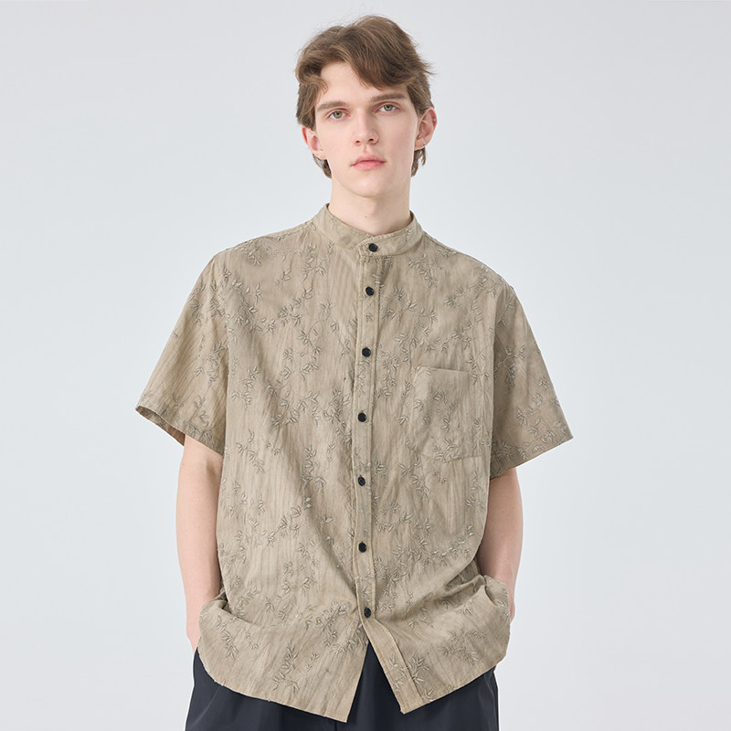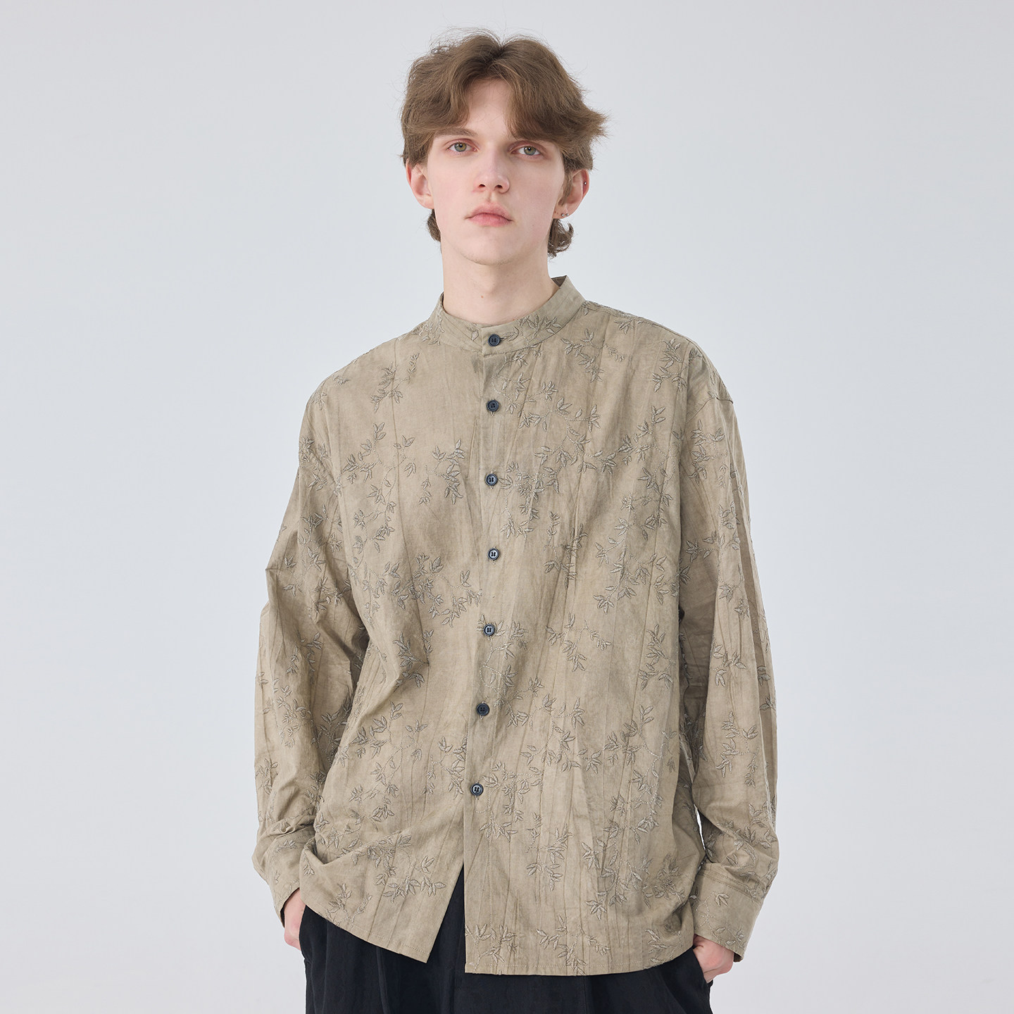 春秋男士新中式衬衫宽松薄款复古长袖刺绣民族风潮流立领衬衣男