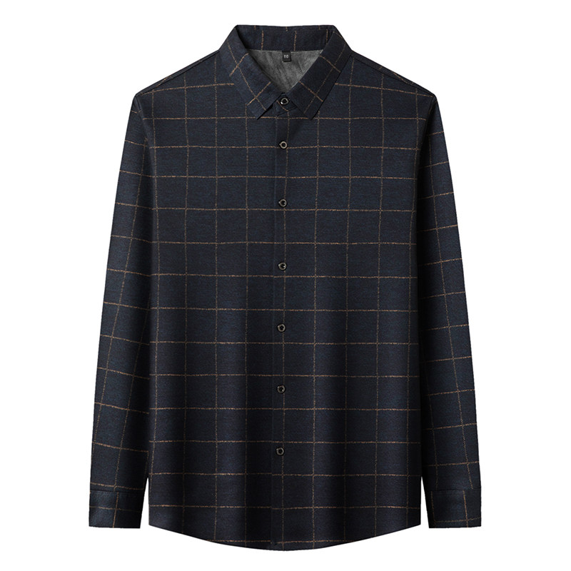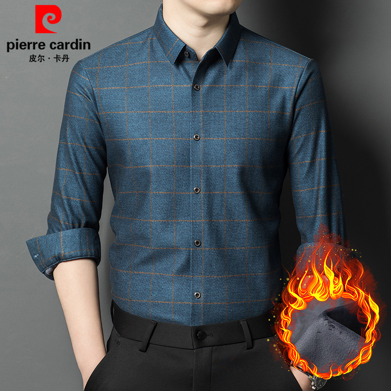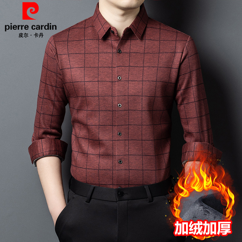 皮尔卡丹冬季长袖格子羊毛衬衫男士加绒加厚商务休闲免烫保暖衬衣