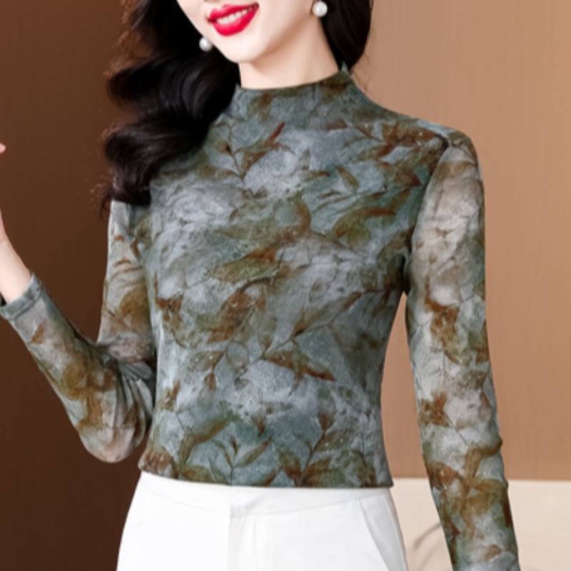中年妈妈秋装半高领花色网纱长袖t恤女士秋减龄内搭打底衫上1003h
