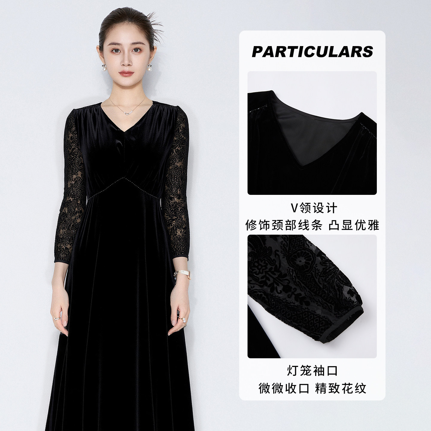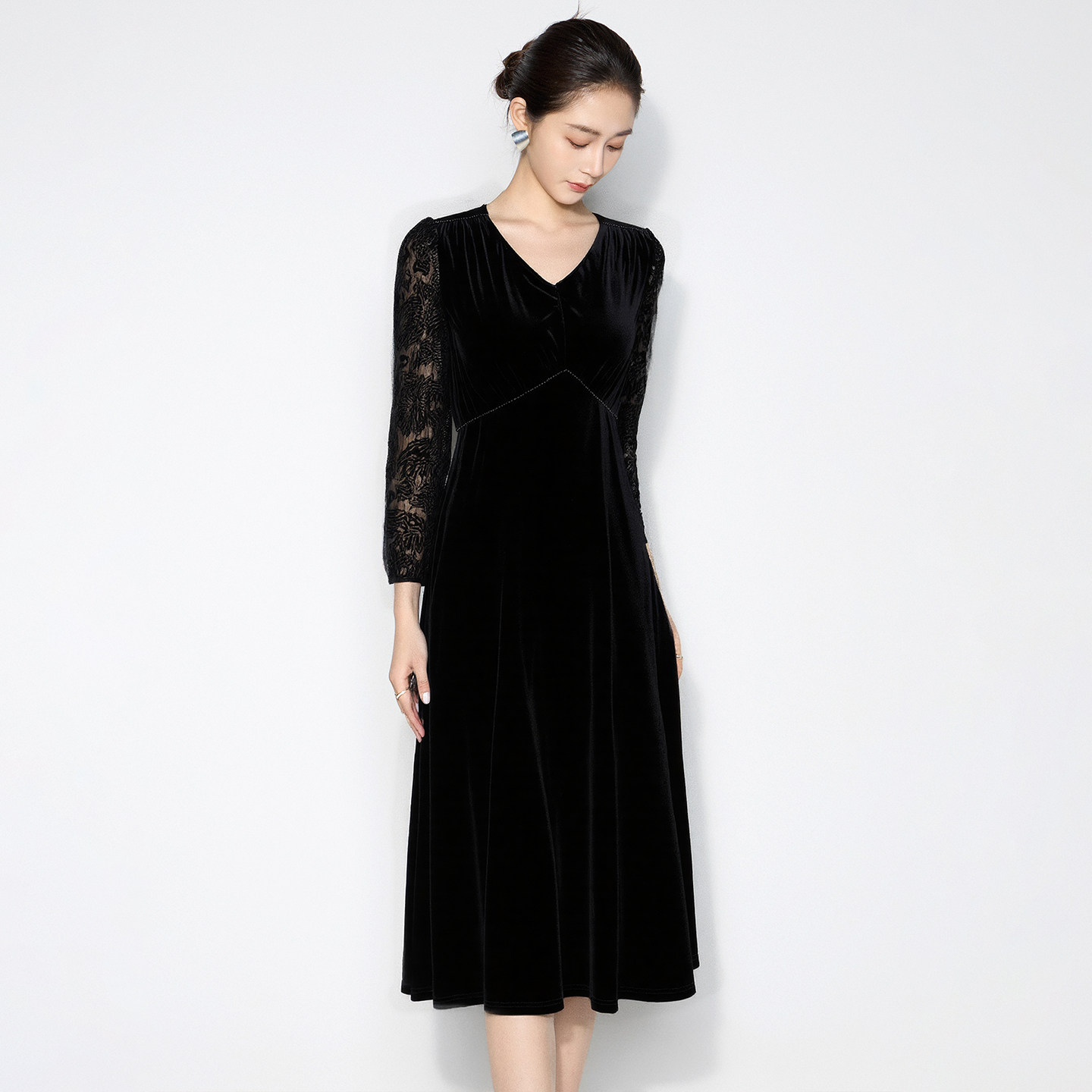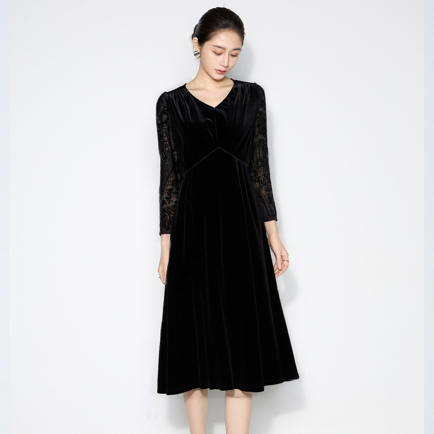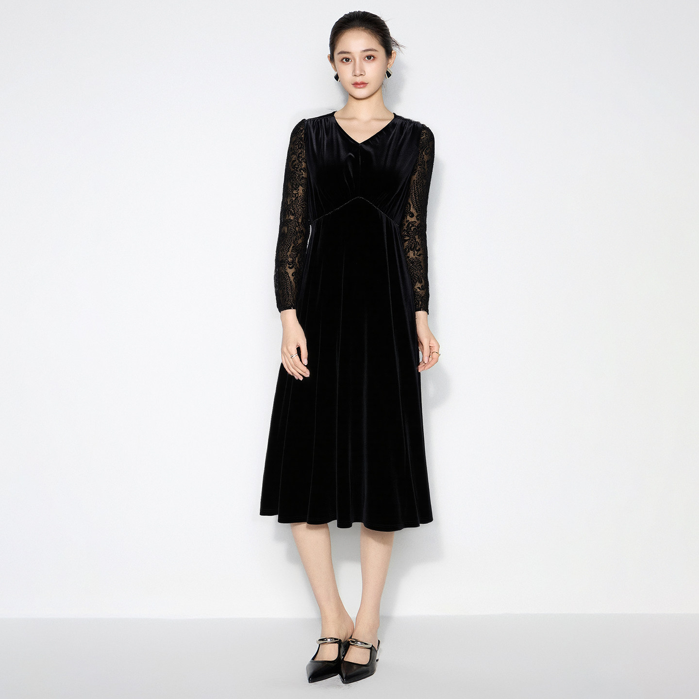 马天奴2025秋冬新款黑色丝绒V领收腰连衣裙子蕾丝袖气质时尚法式
