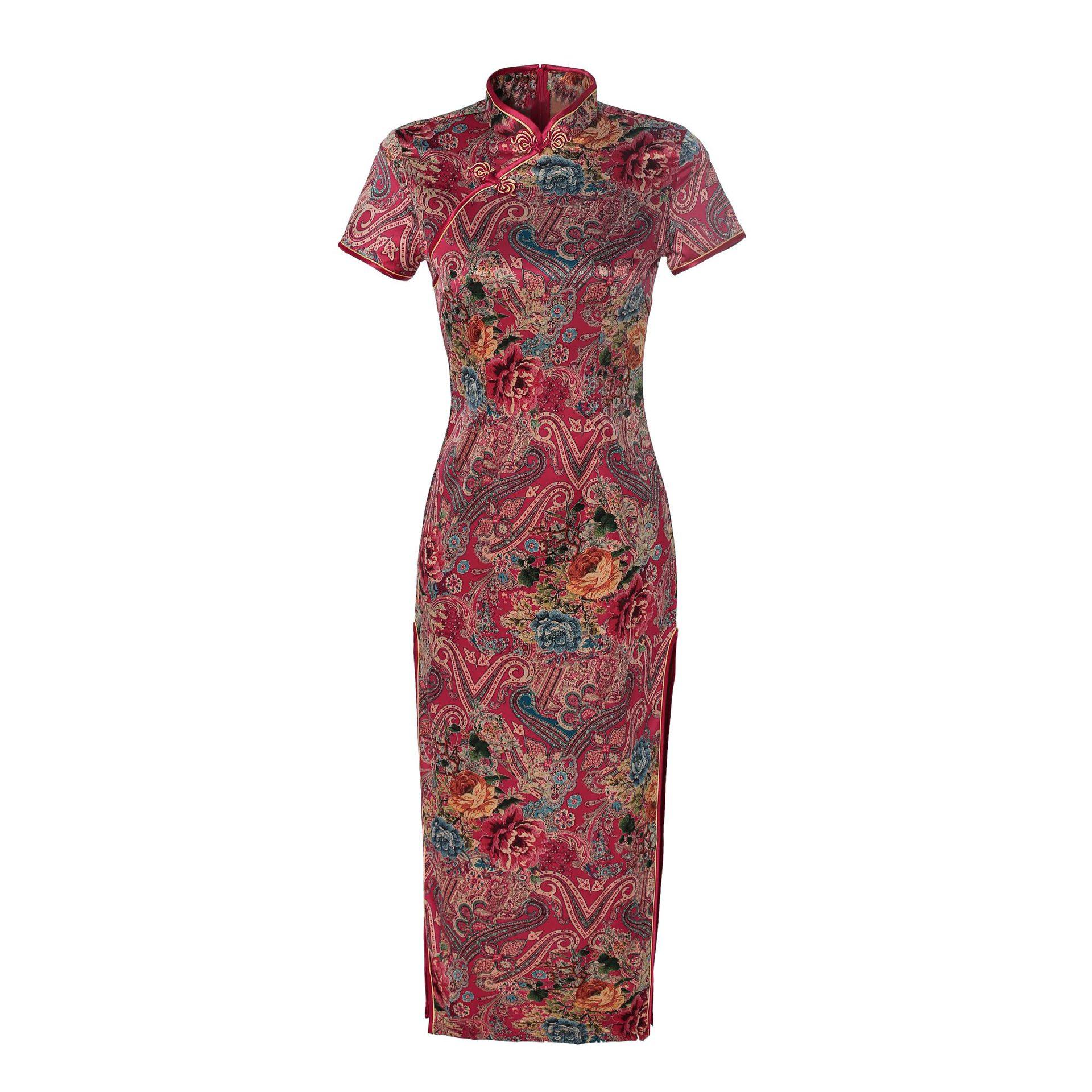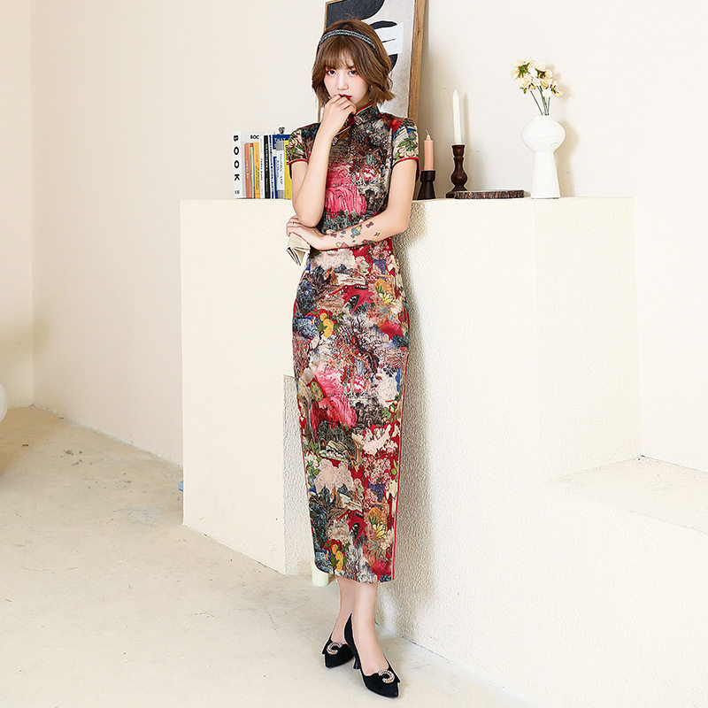 2025新款夏秋长款旗袍裙女装连衣裙修身舞台妈妈装大码中国风绸缎