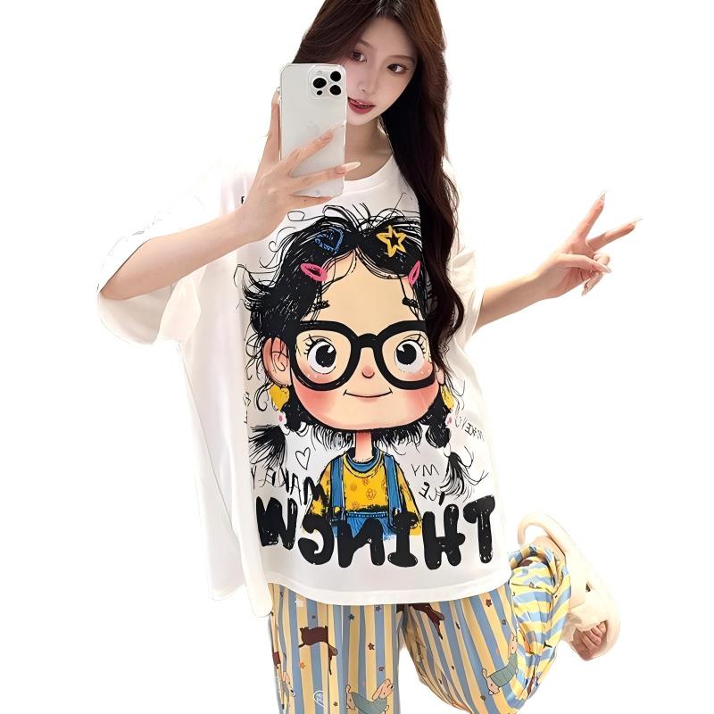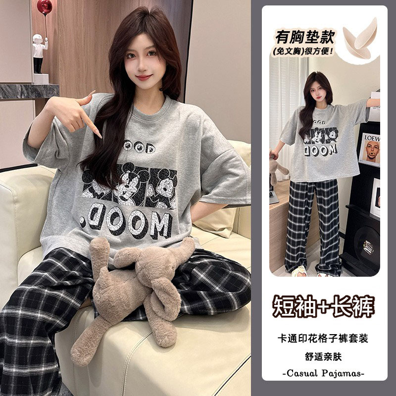 浪莎2025新款带胸垫纯棉睡衣女夏季短袖长裤家居服两件套可外穿