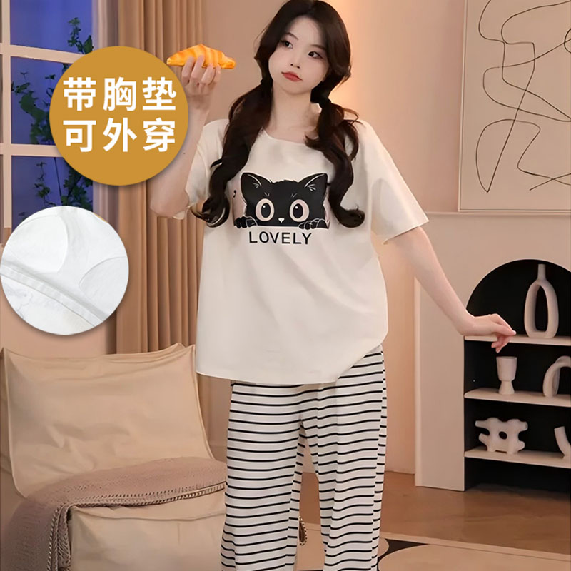 浪莎带胸垫纯棉睡衣女夏季两件套