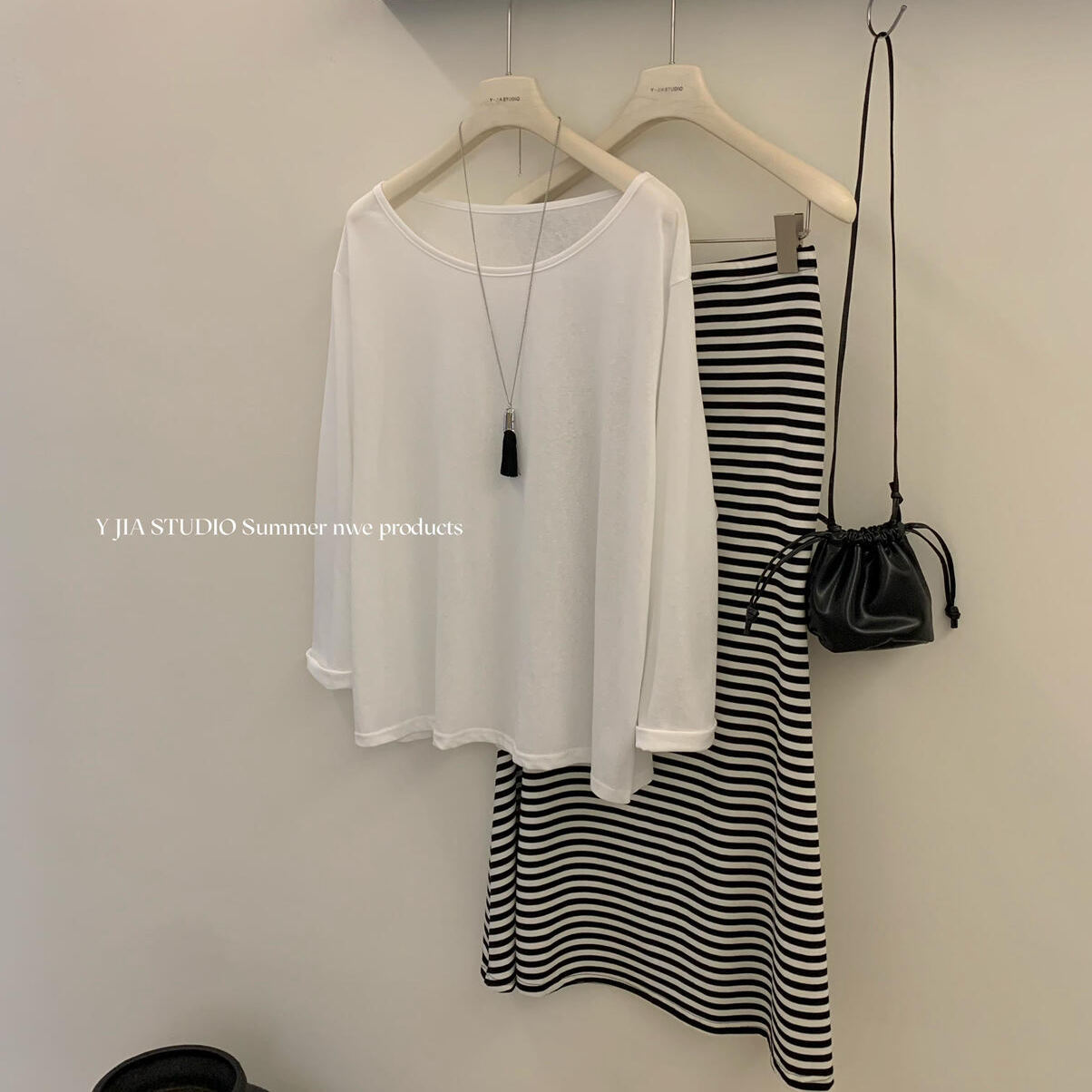 Y.JIA 伊嘉2025十三行春夏长袖防晒T恤+高腰设计感鱼尾半身裙套装