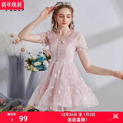 艾丽丝粉色甜美公主裙2025夏季新款爱心刺绣娃娃领减龄短款连衣裙