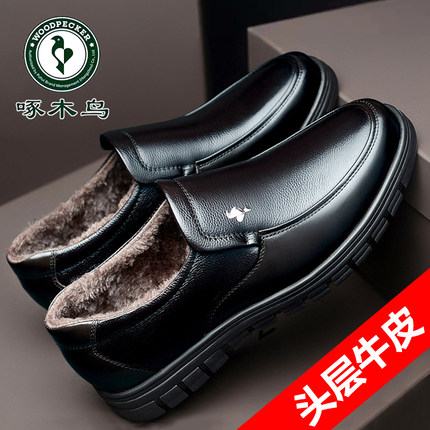啄木鸟春秋季新款休闲皮鞋男士真皮软底加绒保暖棉鞋中老年爸爸鞋