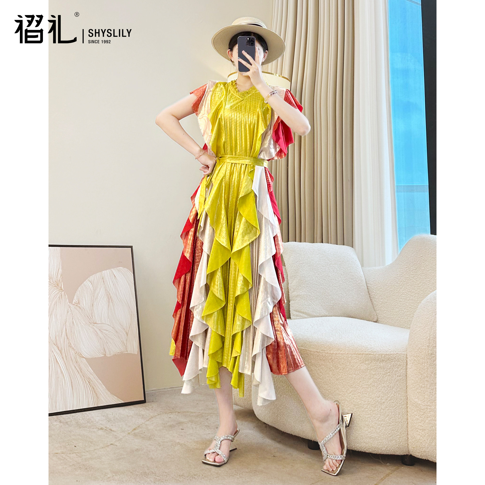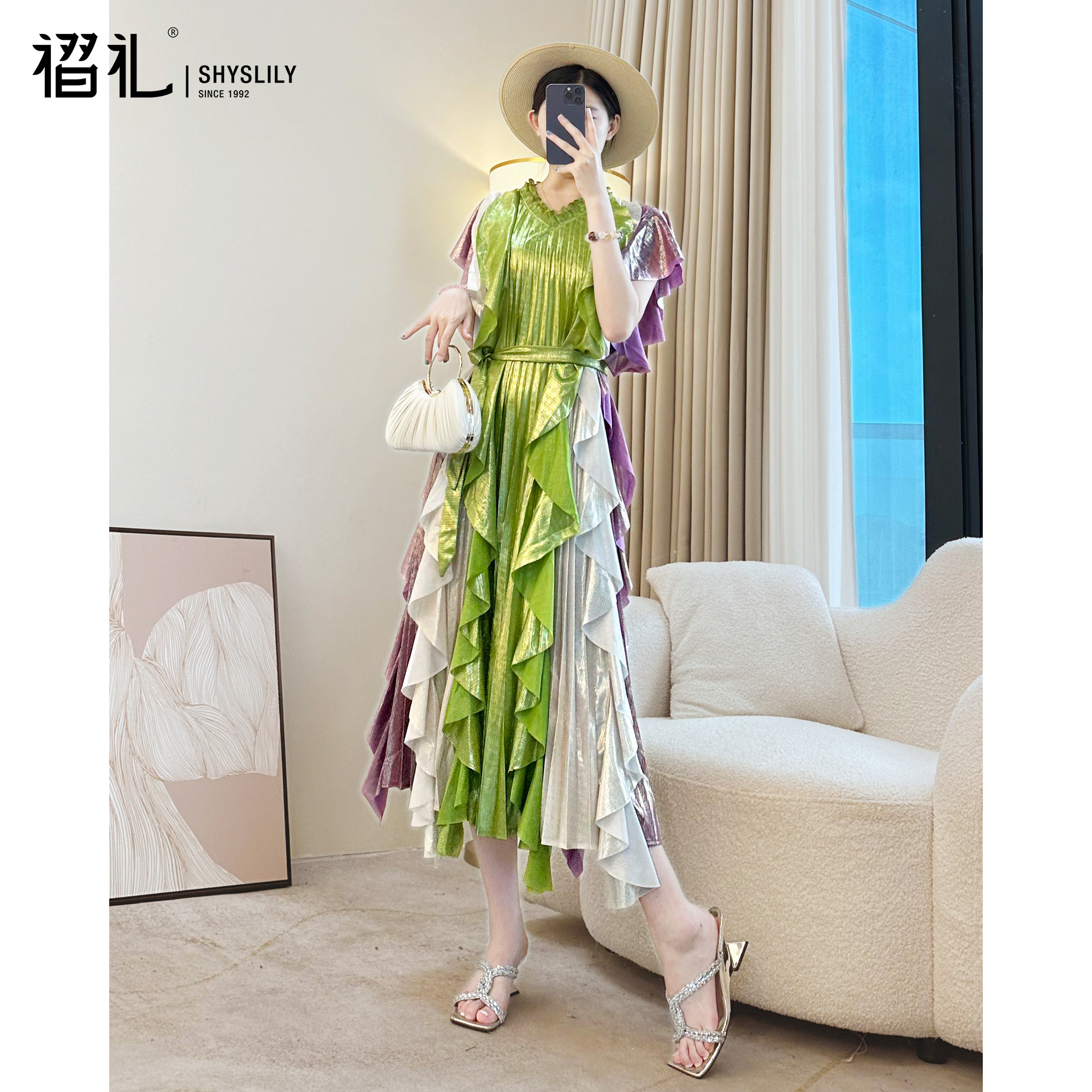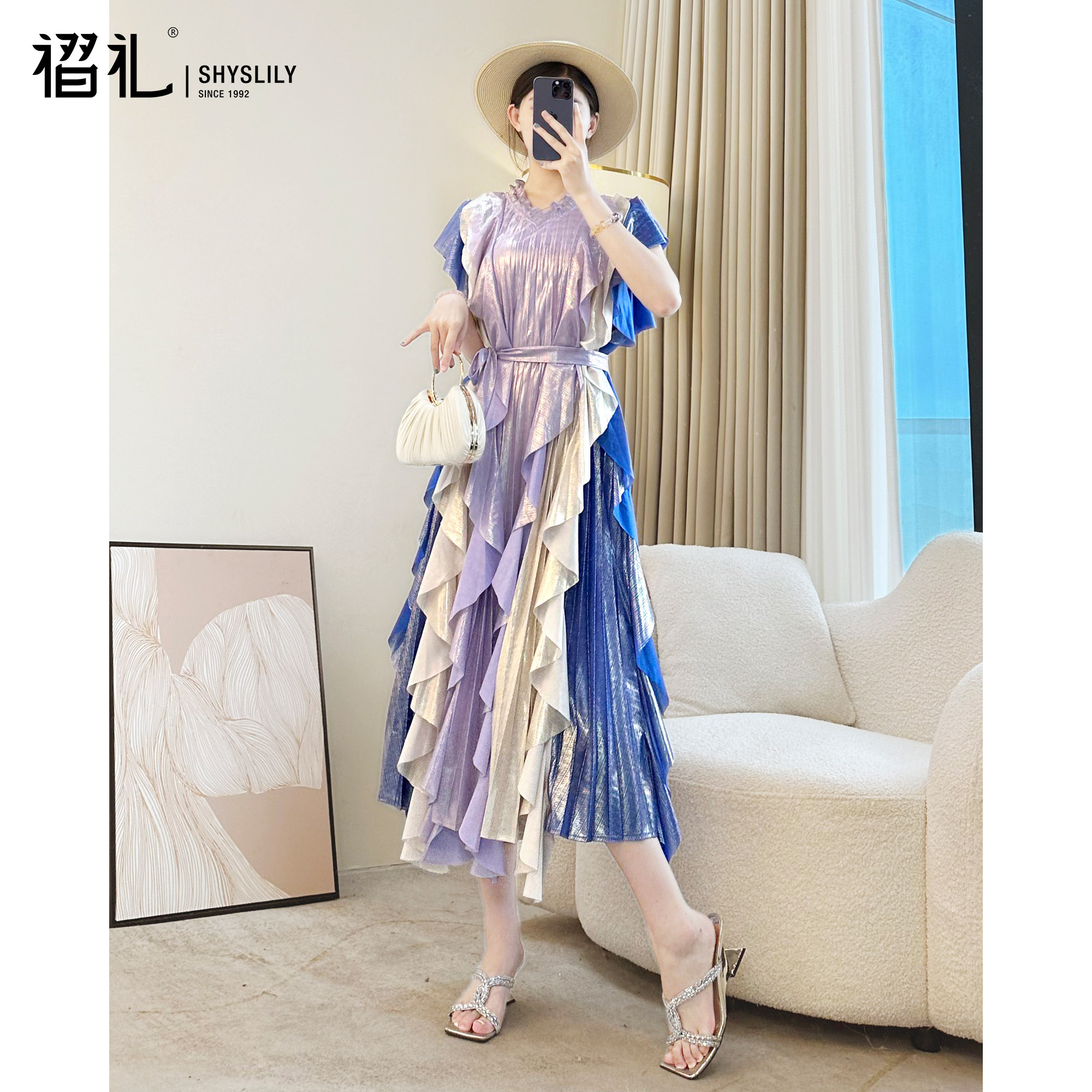 三宅褶皱连衣裙女夏季海边度假风裙子宽松优雅高级无袖中长款裙子