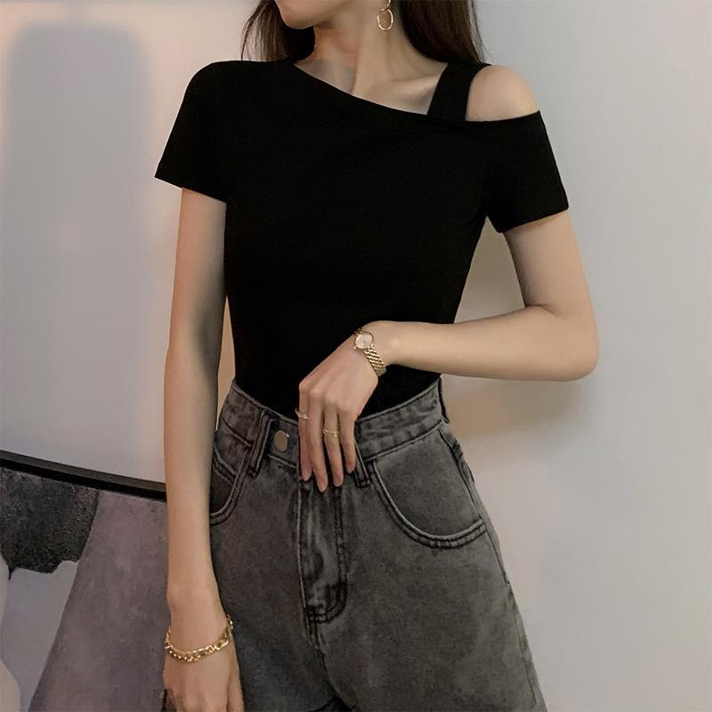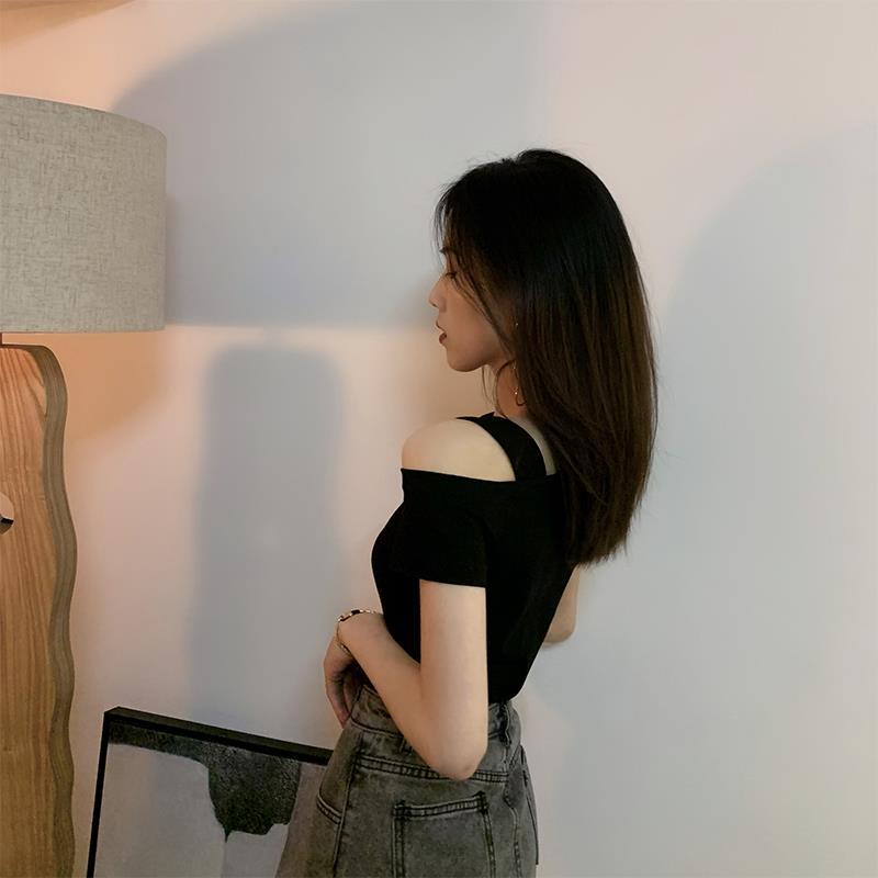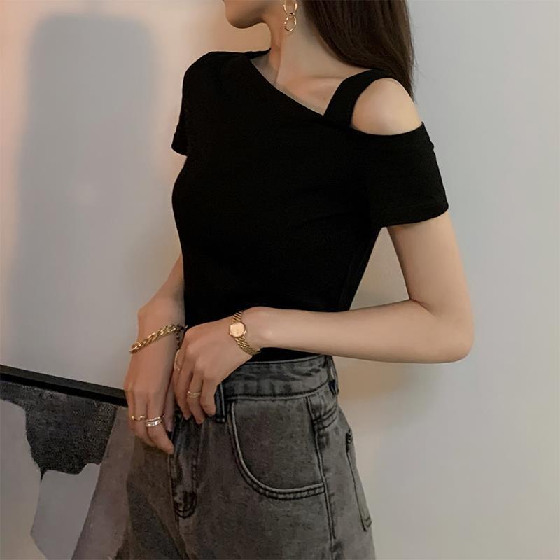 黑色一字肩上衣斜肩短袖女夏季25新款露肩性感锁骨设计感小众t恤