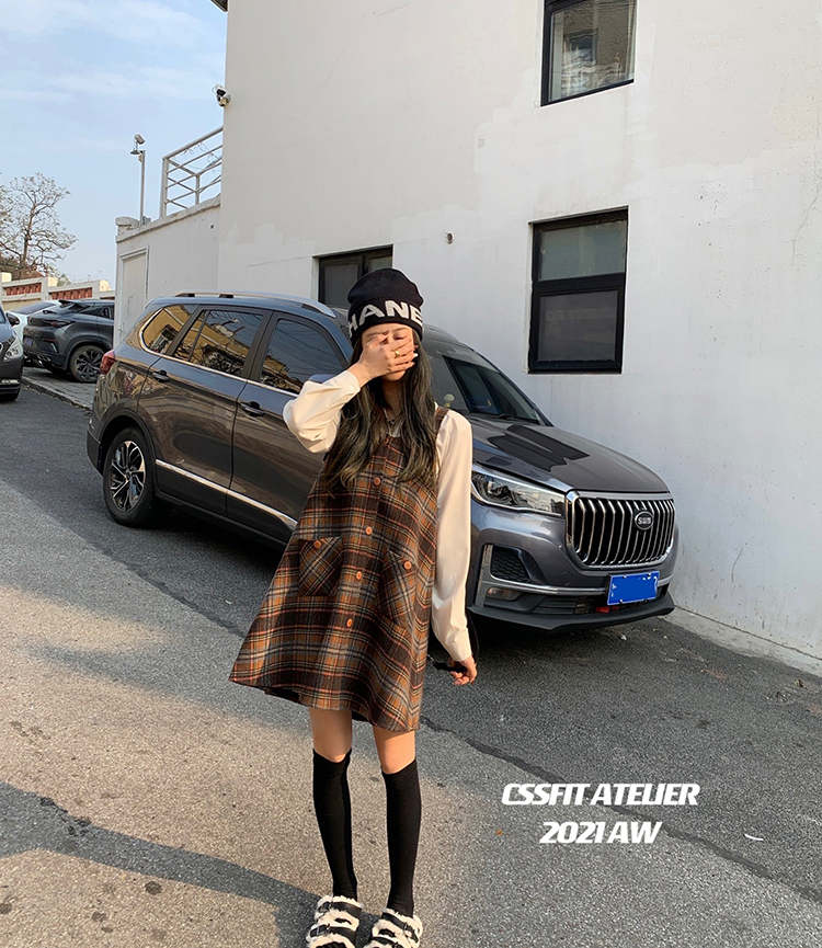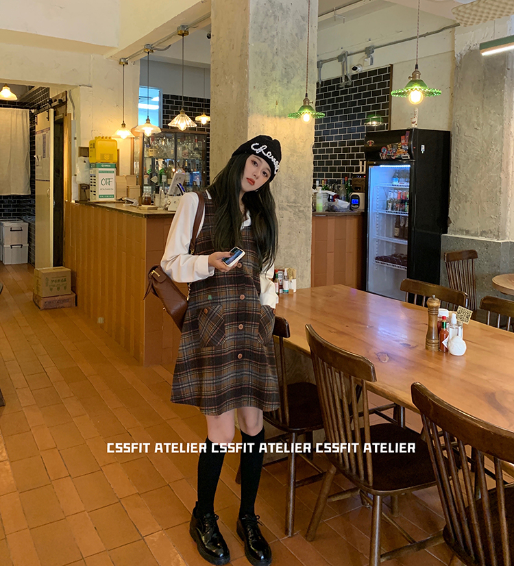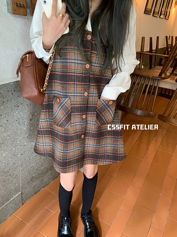 【迟伞伞】复古格调芝士曲奇格纹 红扣背心裙