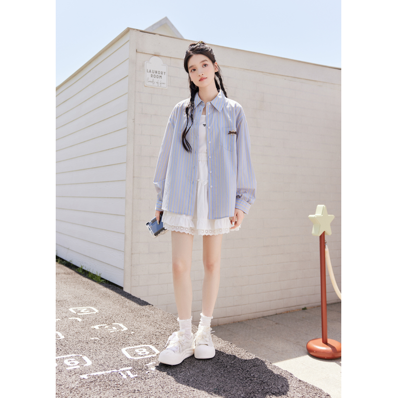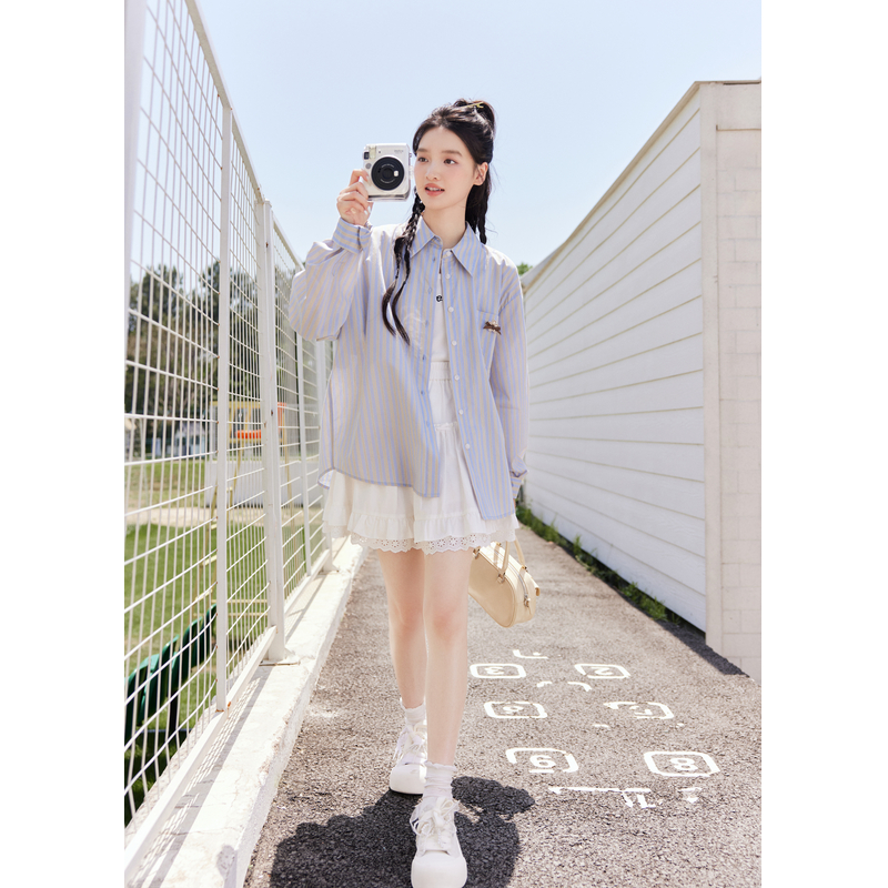 紫涵蓝色竖条纹衬衫女2025年秋季新款清新航海系宽松显瘦长袖衬衣