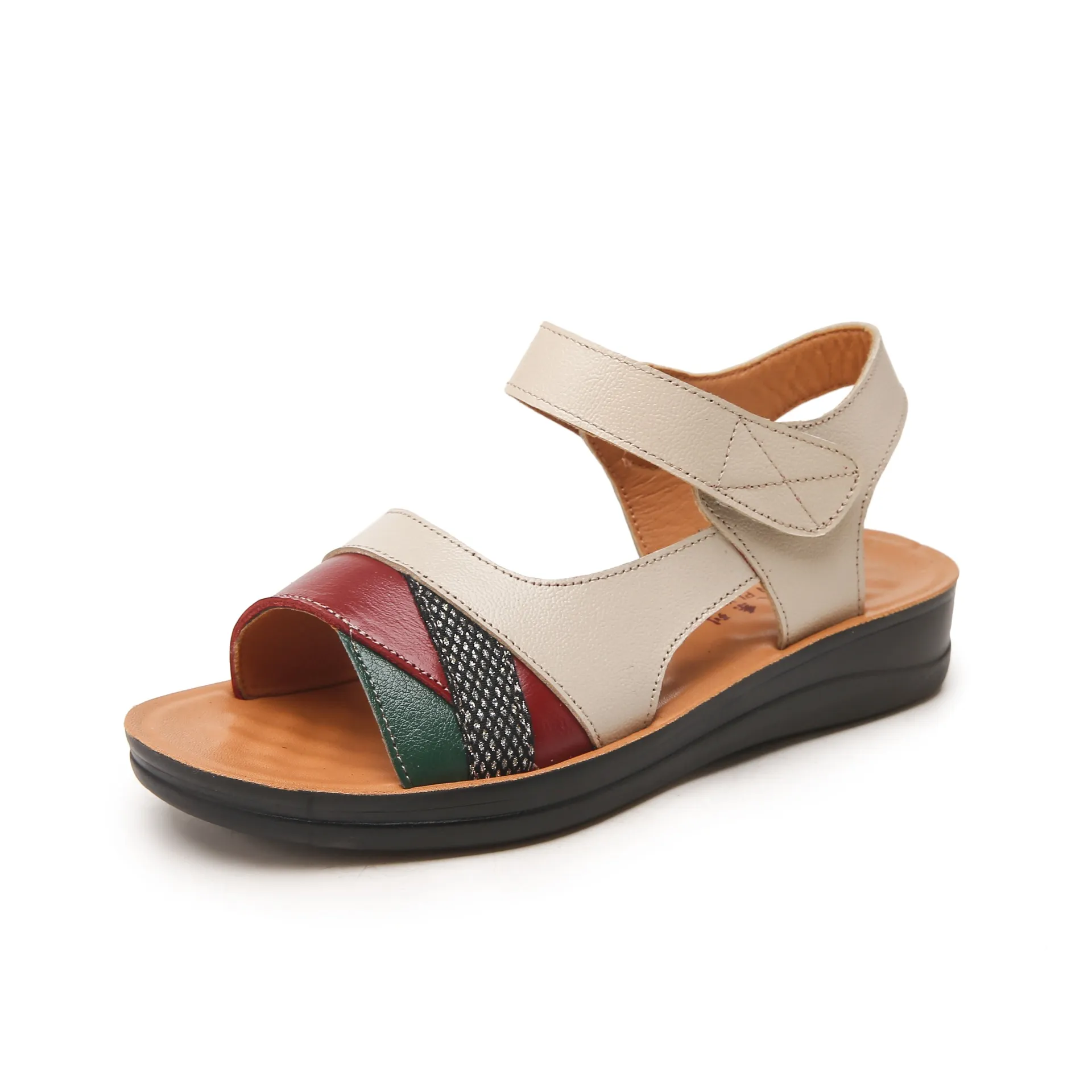 头层牛皮软底中老年平底凉鞋