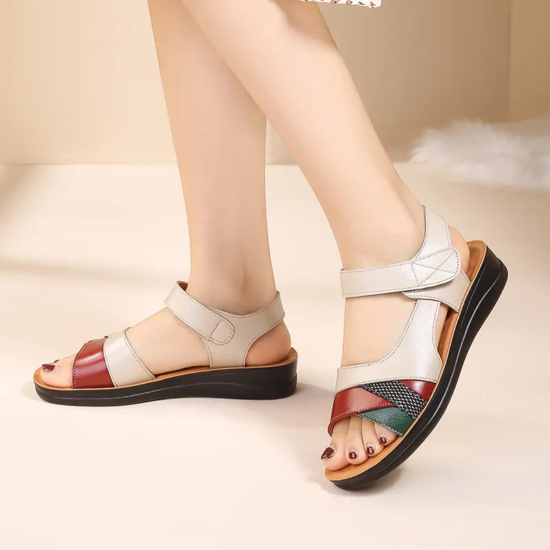 妈妈鞋凉鞋头层牛皮软底女舒适中老年平底防滑老人奶奶夏季凉拖鞋