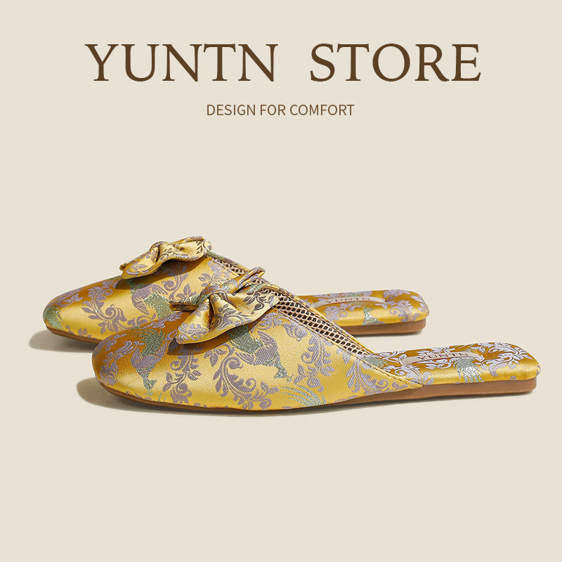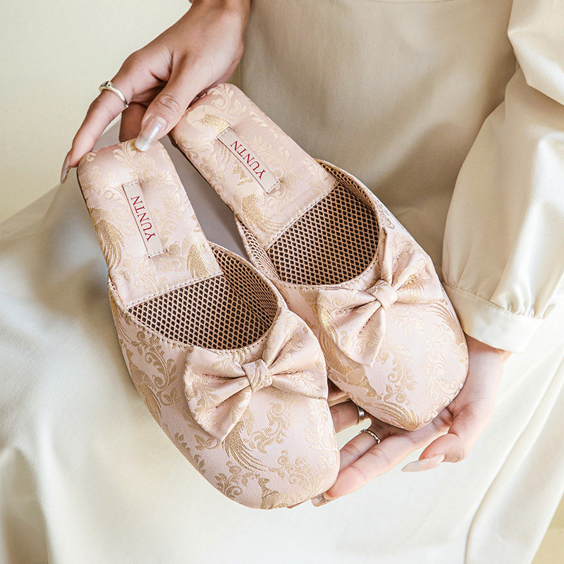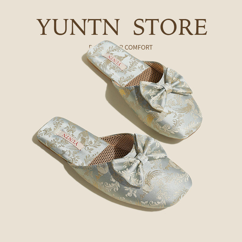 秋季淑女优雅高级感新中式缎面蝴蝶结凉拖鞋女士防滑牛筋底居家鞋