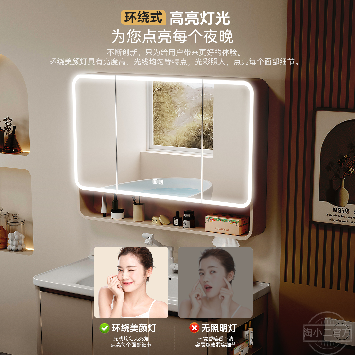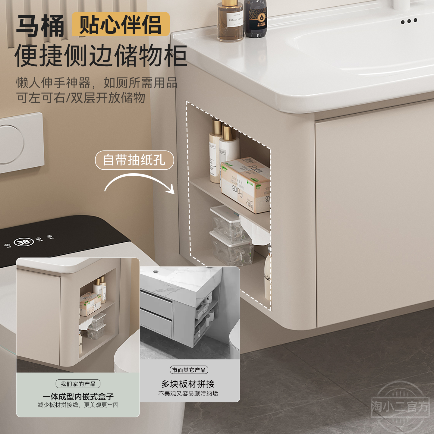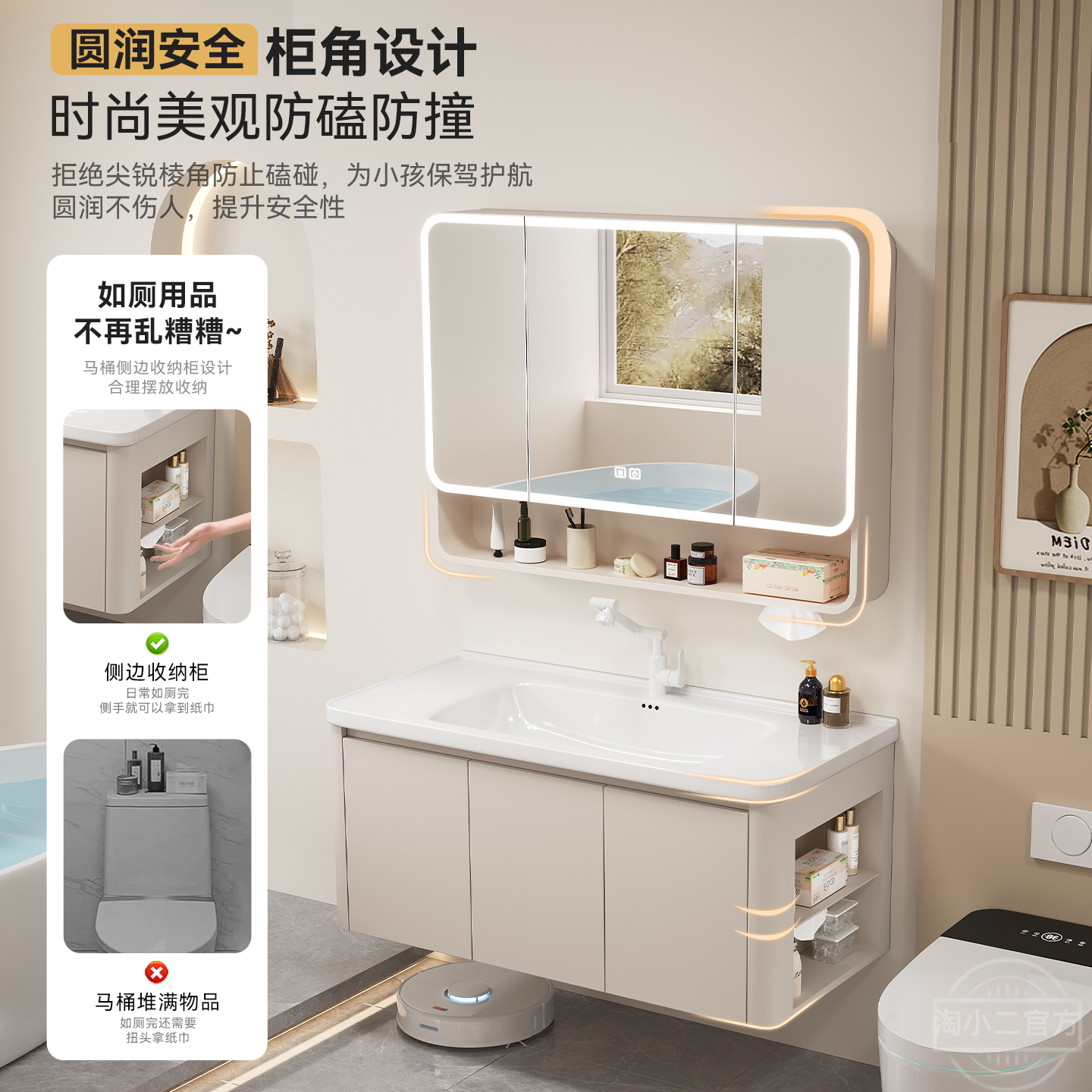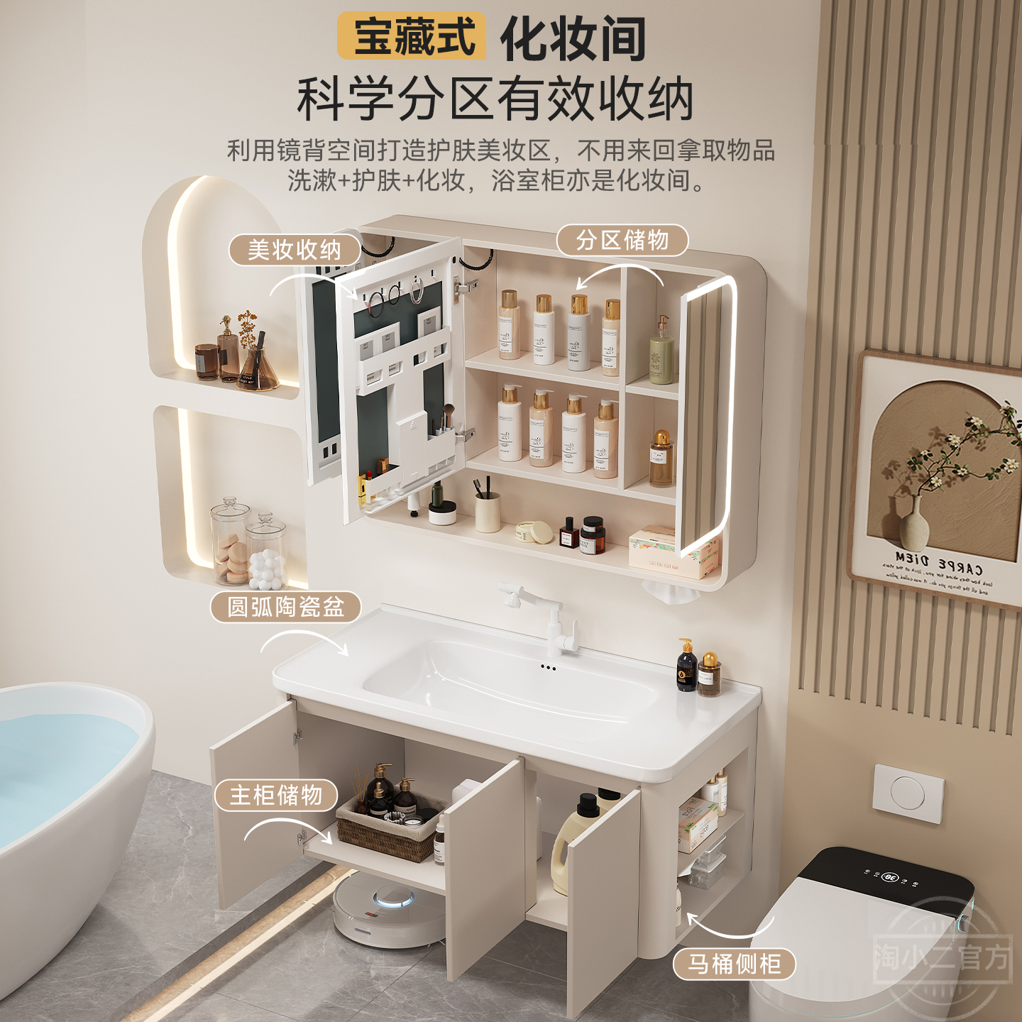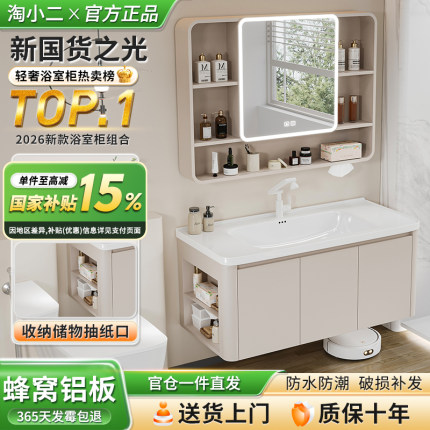 太空蜂窝铝浴室柜组合奶油风带侧边格圆弧陶瓷一体盆卫生间洗手盆