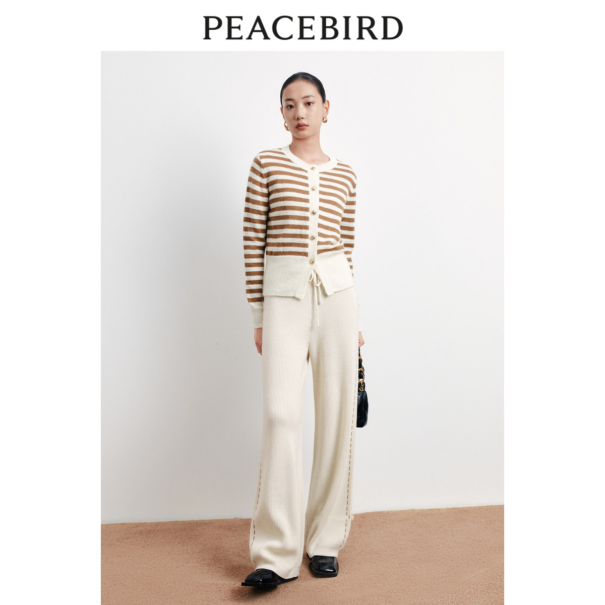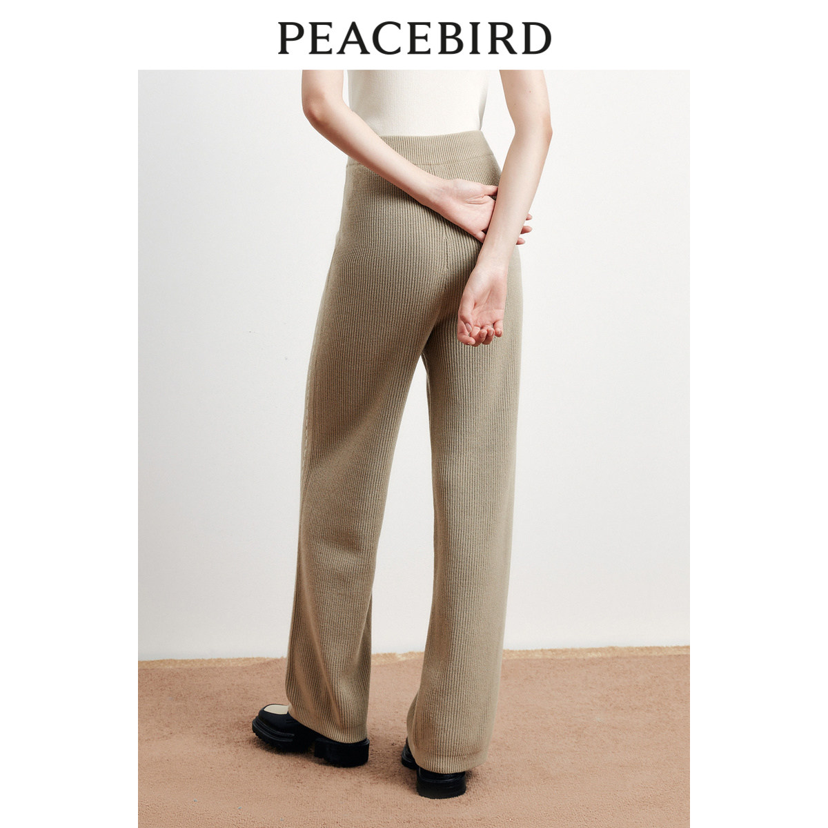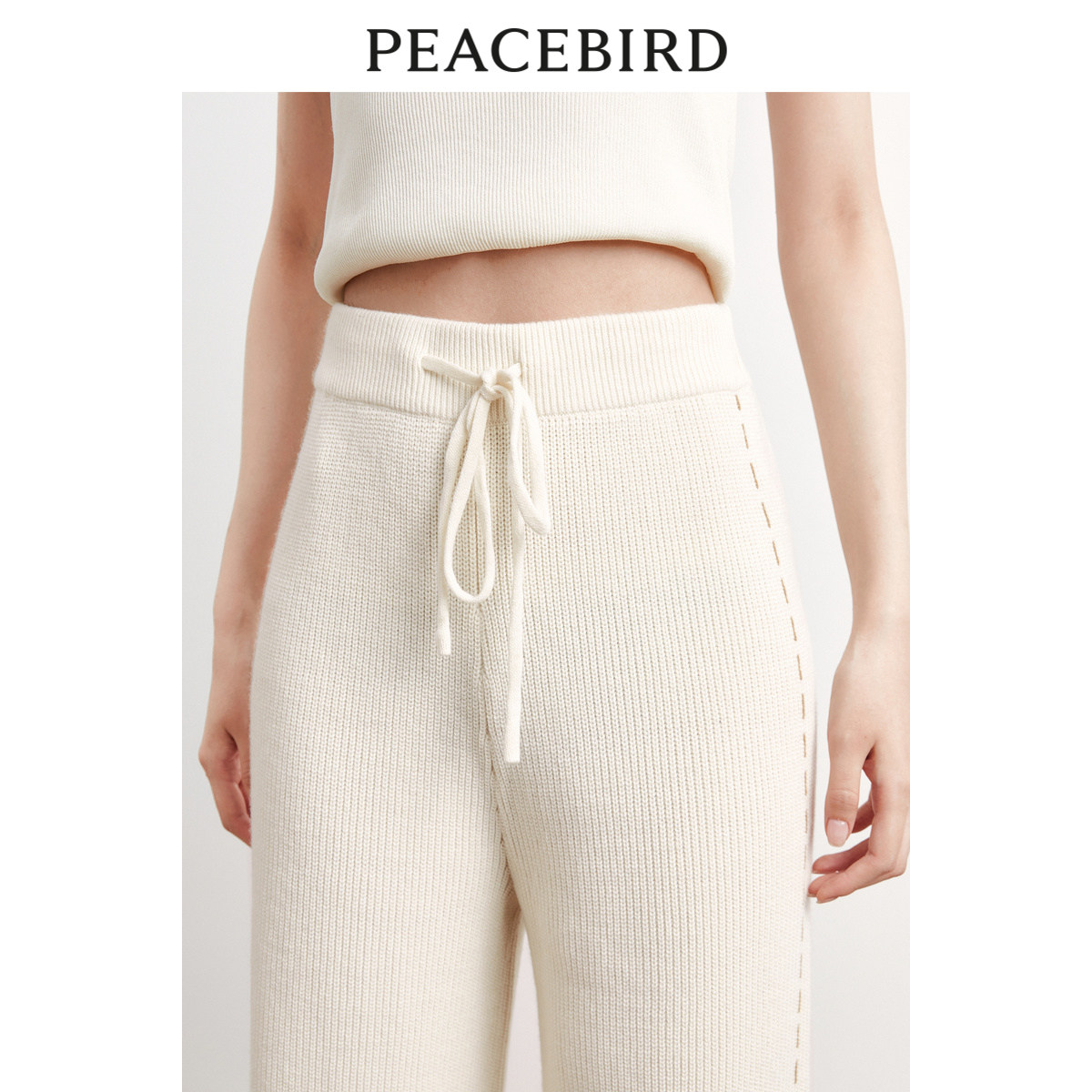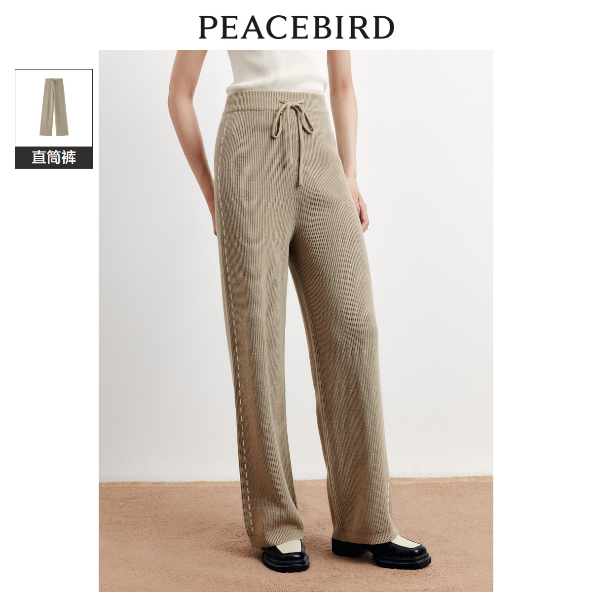 太平鸟女装阔腿直筒毛线针织裤冬季宽松时髦撞色裤奥莱