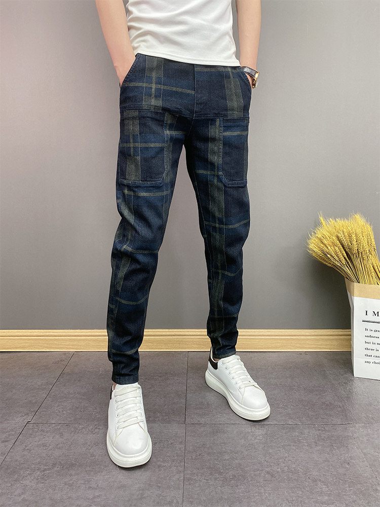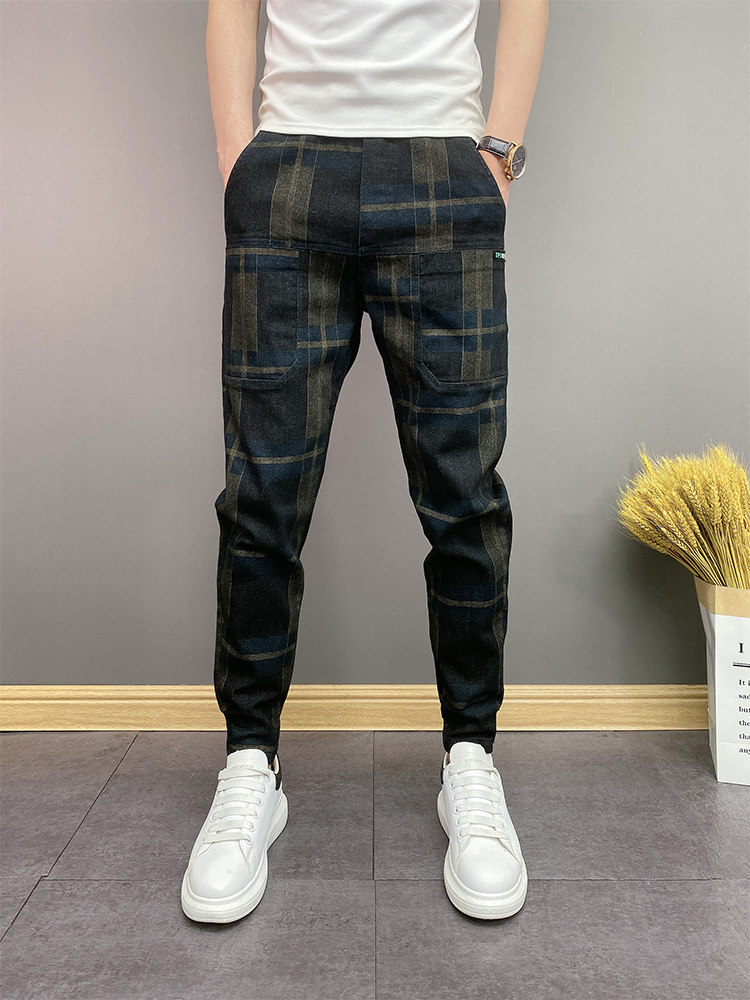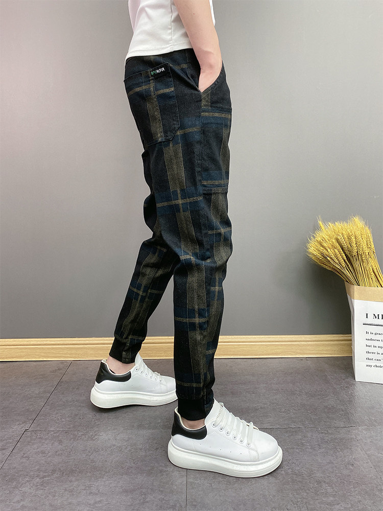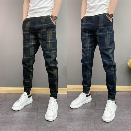 2025年春季新款潮流韩版格子束脚裤青年男士百搭ins休闲牛仔裤子